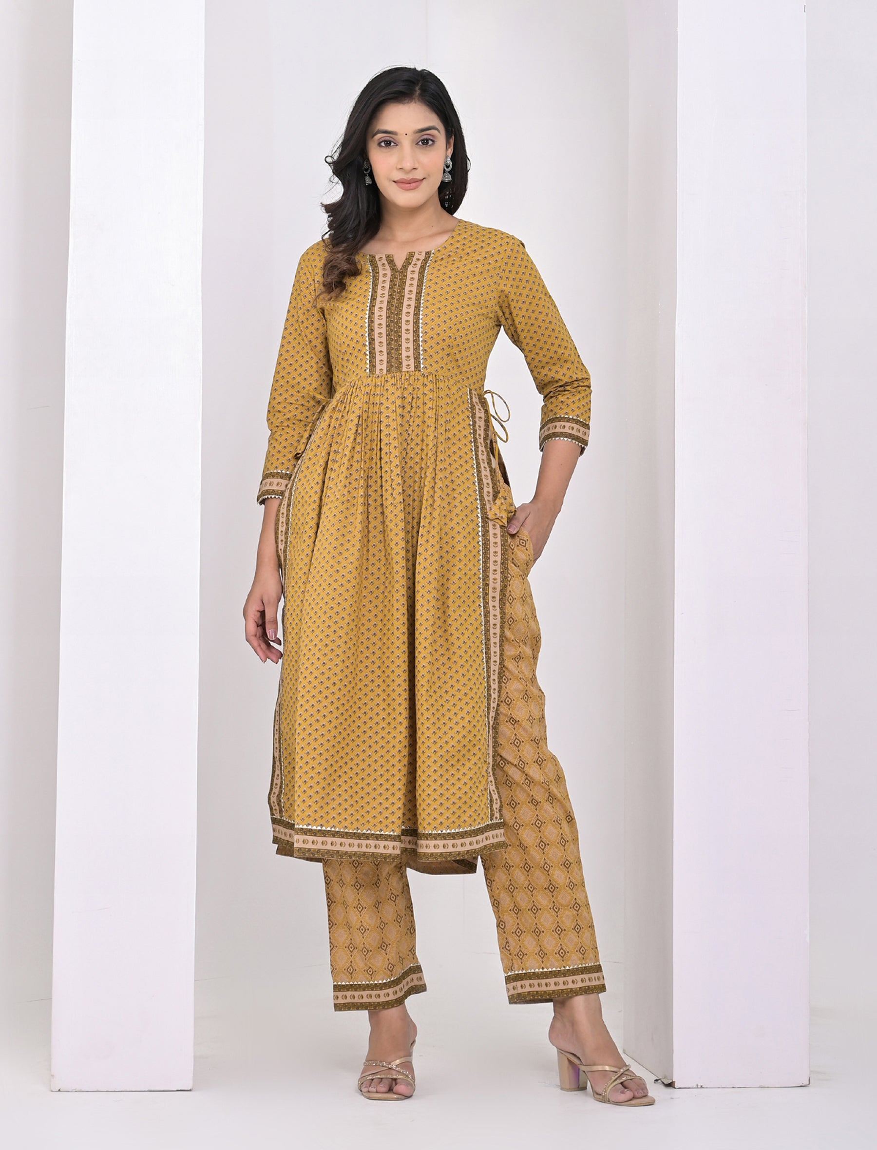 This printed ethnic wear kurta set is presented to you by Gulabchand Prints, A well-known brand in hand block prints from over 9 decades. This exclusively hand stitched kurta set is made of 100% pure cotton fabric with having printed prints over it. The kurta set is best suitable for you to showcase your women hood. Wear this at your ease and the fabric is so smooth to skin that you will love it and the attractive prints adds more charm to the same.