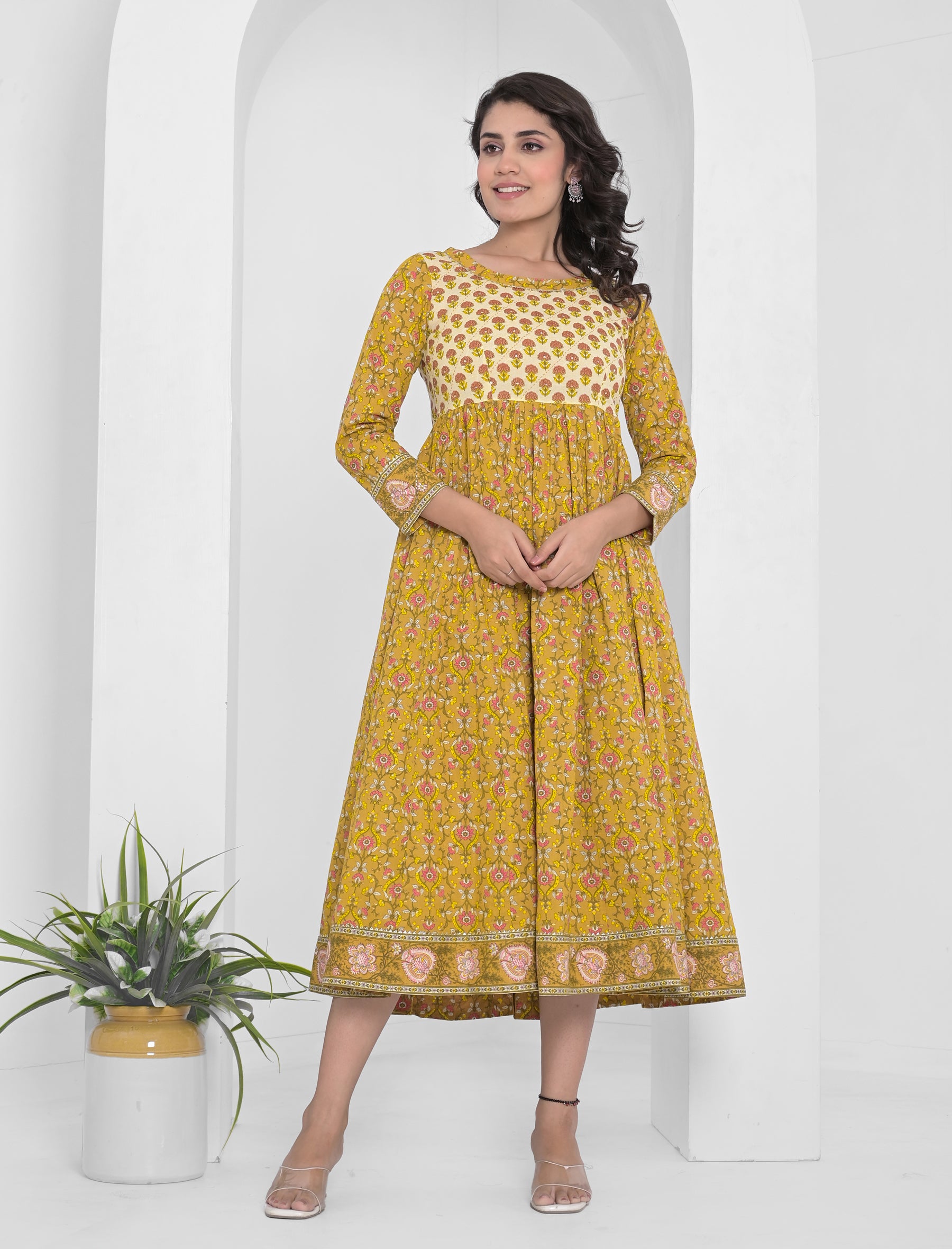 This printed ethnic wear dress is presented to you by Gulabchand Prints, A well-known brand in hand block prints from over 9 decades. This exclusively hand stitched dress is made of 100% pure cotton fabric with having printed prints over it. The dress is best suitable for you to showcase your women hood. Wear this at your ease and the fabric is so smooth to skin that you will love it and the attractive prints adds more charm to the same.