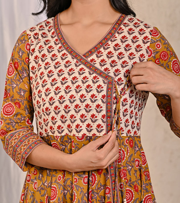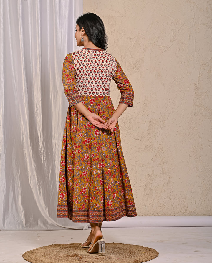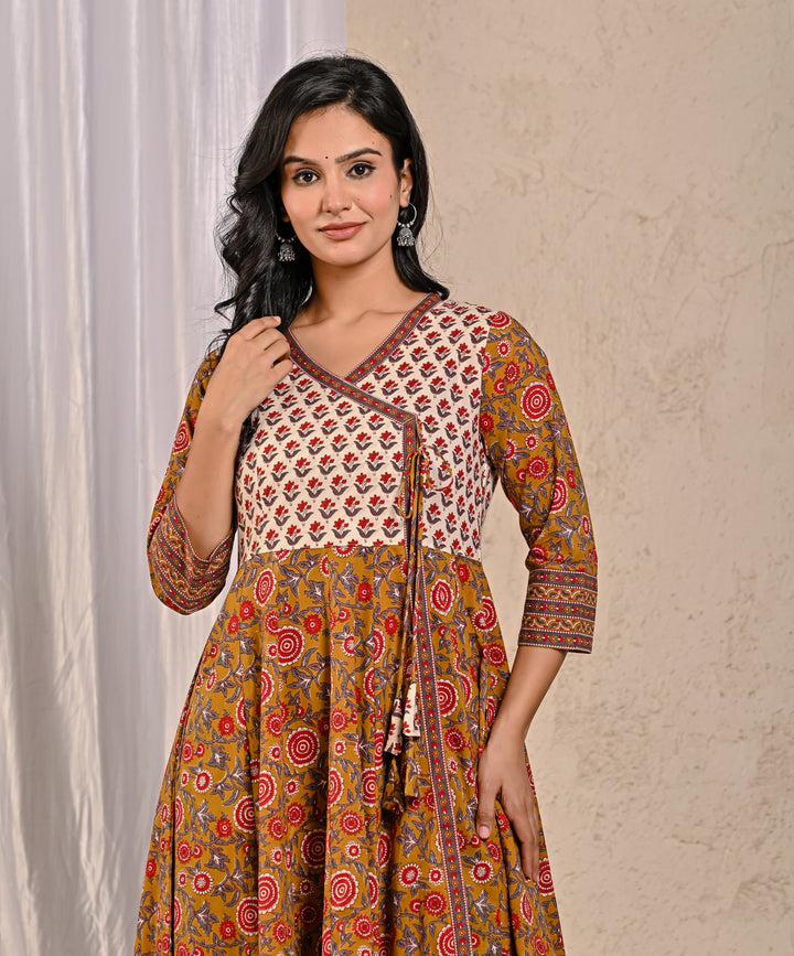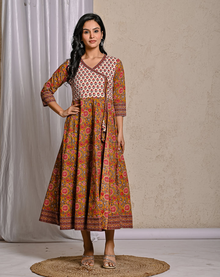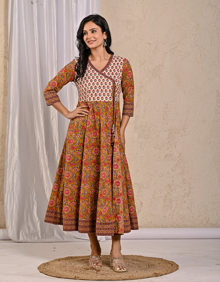 This long Angrakha cotton dress showcases the traditional mustard Jaal Jaipuri print, combining classic design with comfortable 100% cotton fabric for a refined and elegant look.