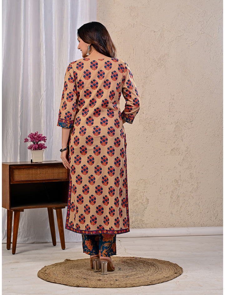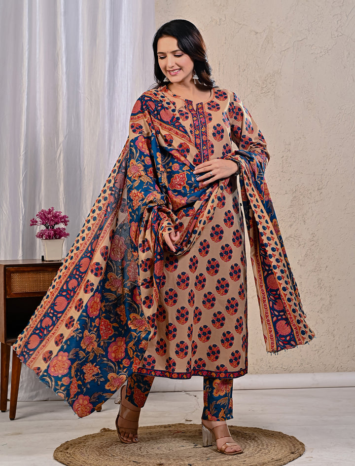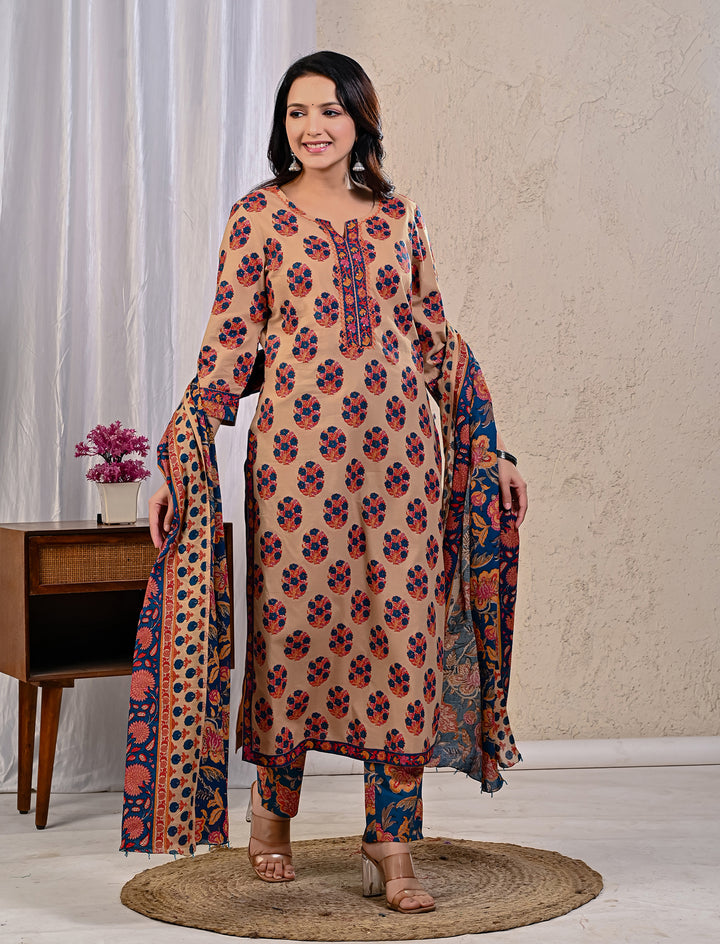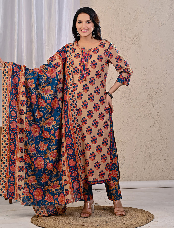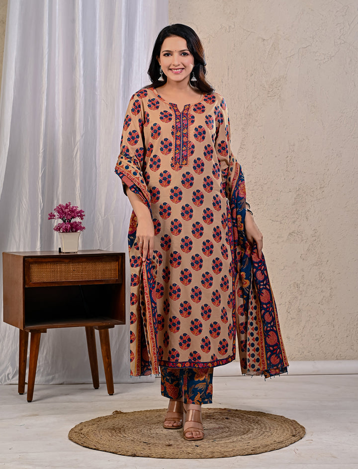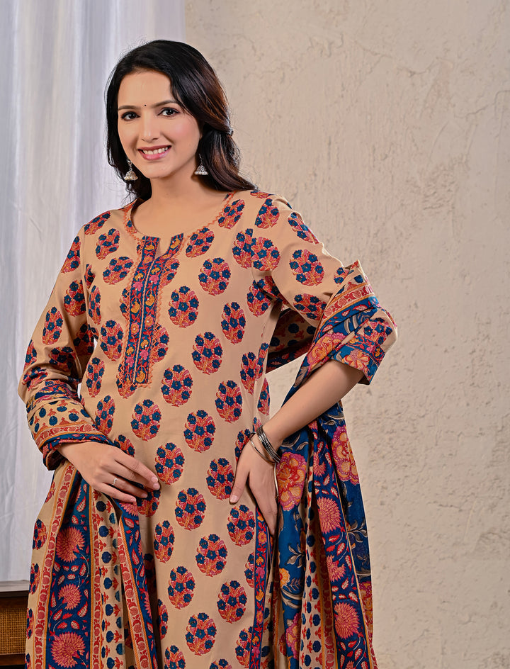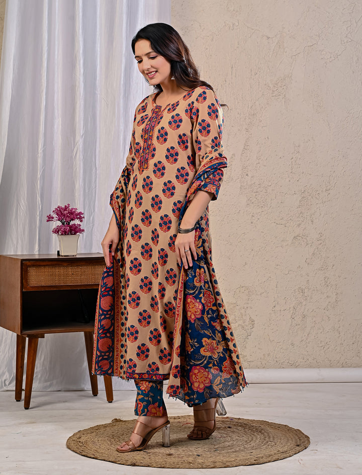 Beige Butta Block Printed Cotton Kurta Pant Set With Mulmul Dupatta