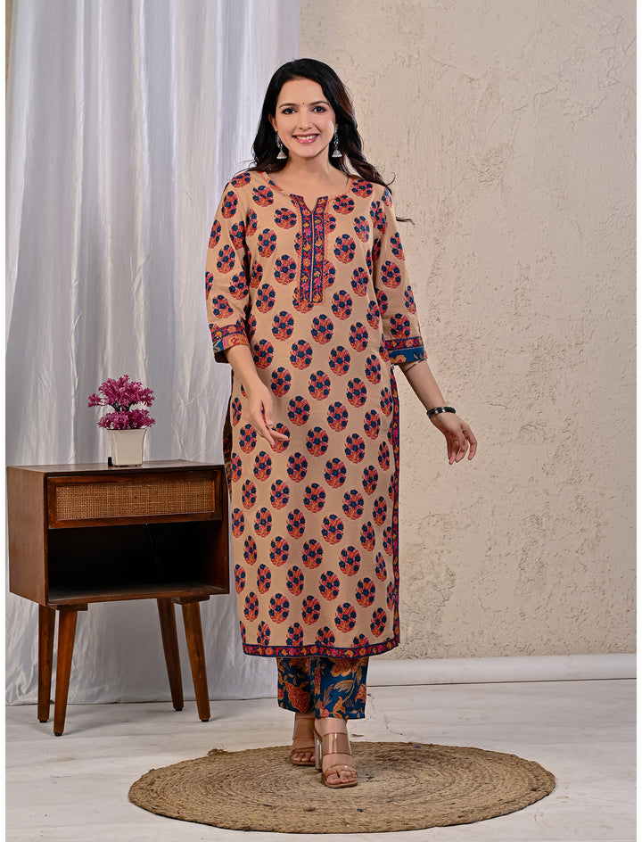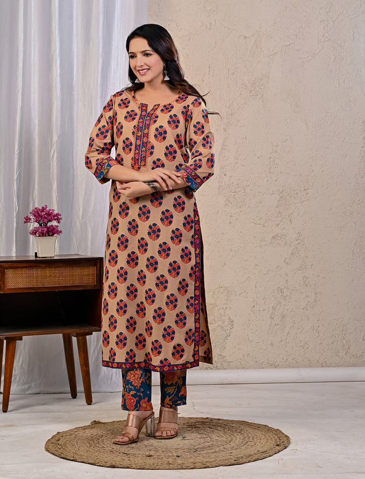 This printed ethnic wear kurta set is presented to you by Gulabchand Prints, A well-known brand in hand block prints from over 9 decades. This exclusively hand stitched kurta set is made of 100% pure cotton fabric with having printed prints over it. The kurta set is best suitable for you to showcase your women hood. Wear this at your ease and the fabric is so smooth to skin that you will love it and the attractive prints adds more charm to the same.