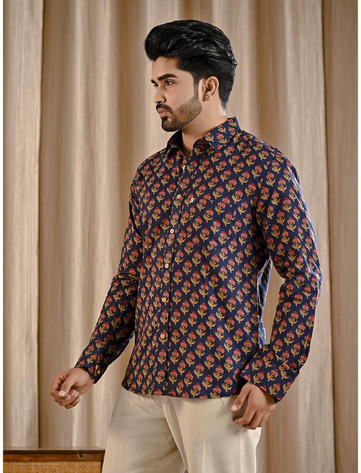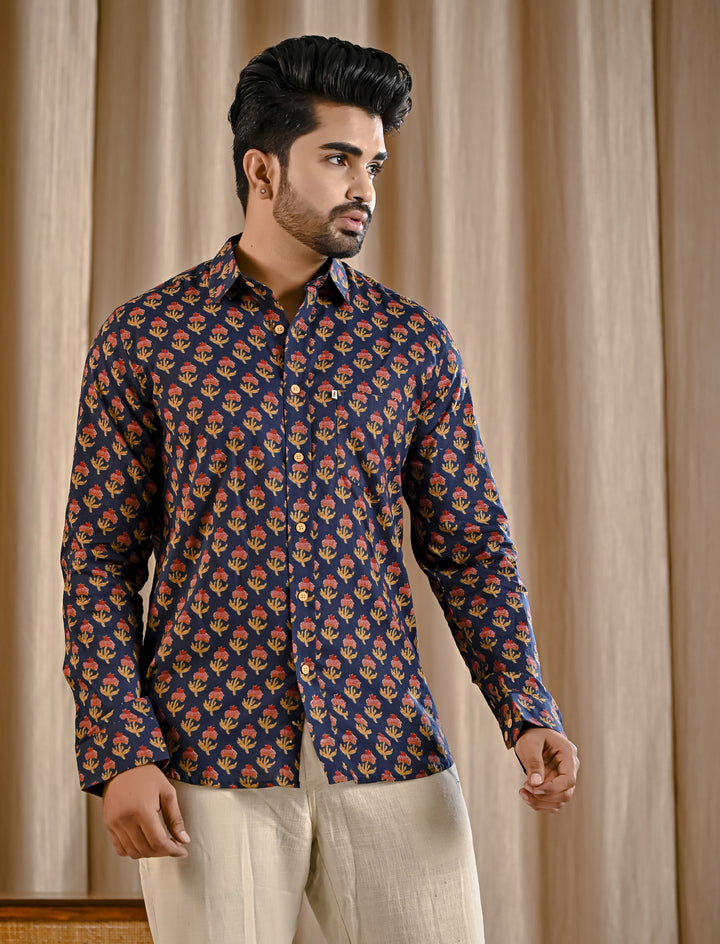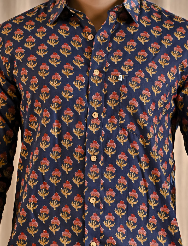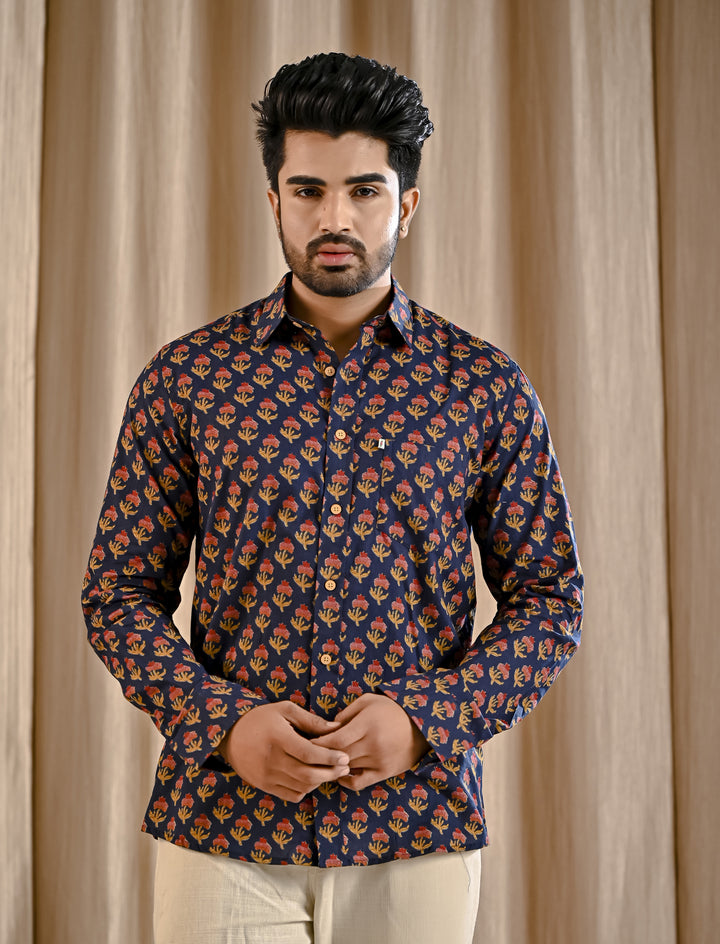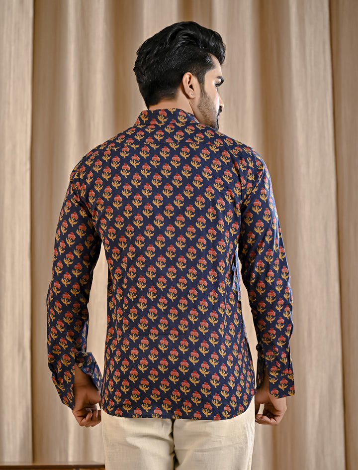 This hand block printed cotton shirt is presented to you by Gulabchand Prints, A well-known brand in hand block prints from over 9 decades. This exclusively hand stitched shirt is made of 100% pure cotton fabric with having hand block printed prints over it. Wear this at your ease and the fabric is so smooth to skin that you will love it and the attractive prints adds more charm to the same.