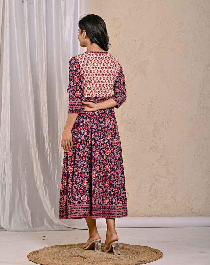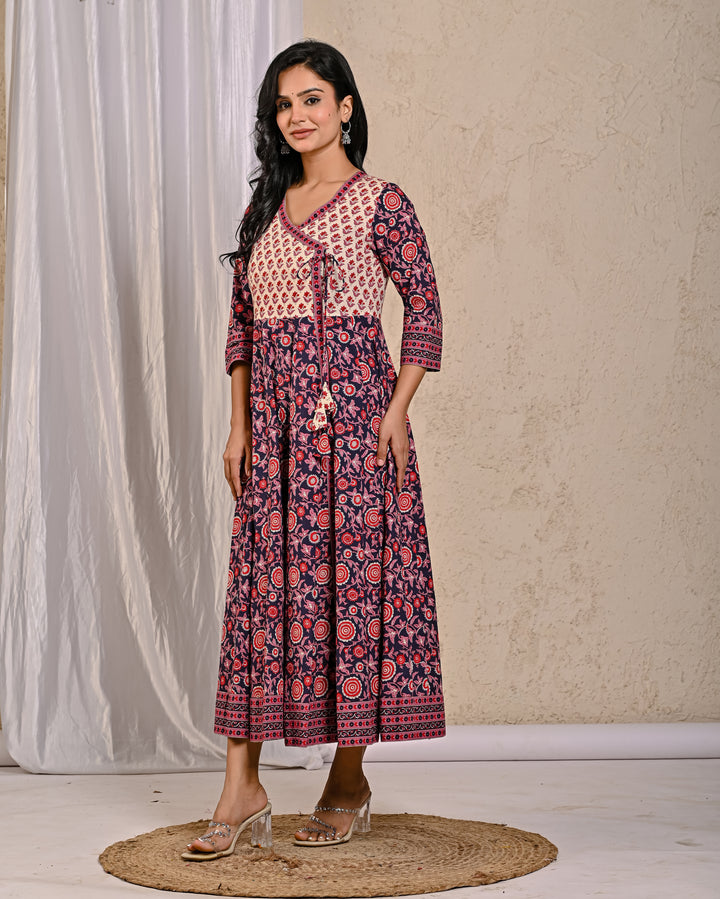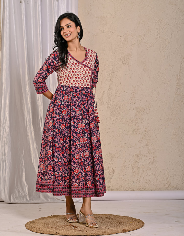 This long Angrakha cotton dress showcases the traditional Navy Jaal Jaipuri print, combining classic design with comfortable 100% cotton fabric for a refined and elegant look.