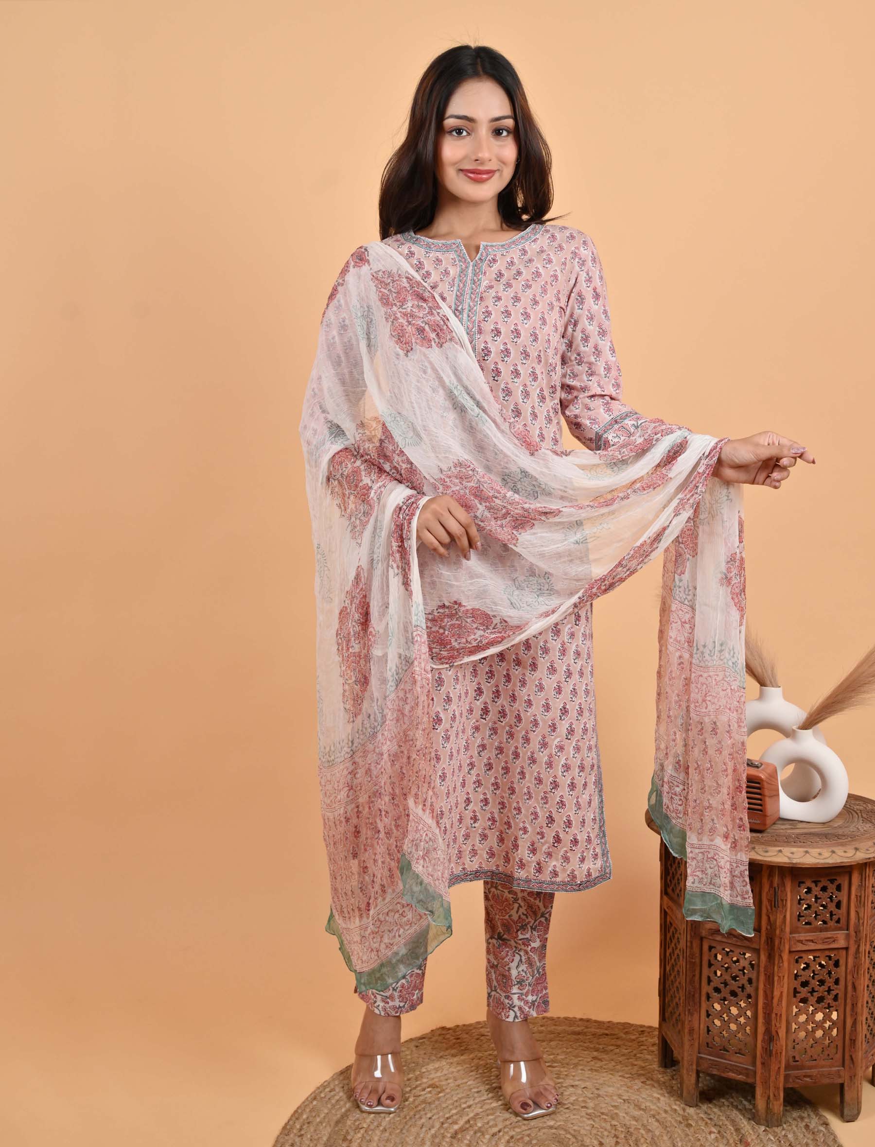 This printed ethnic wear kurta set is presented to you by Gulabchand Prints, A well-known brand in hand block prints from over 9 decades. This exclusively hand stitched kurta set is made of 100% pure cotton fabric with having printed prints over it. The kurta set is best suitable for you to showcase your women hood. Wear this at your ease and the fabric is so smooth to skin that you will love it and the attractive prints adds more charm to the same.