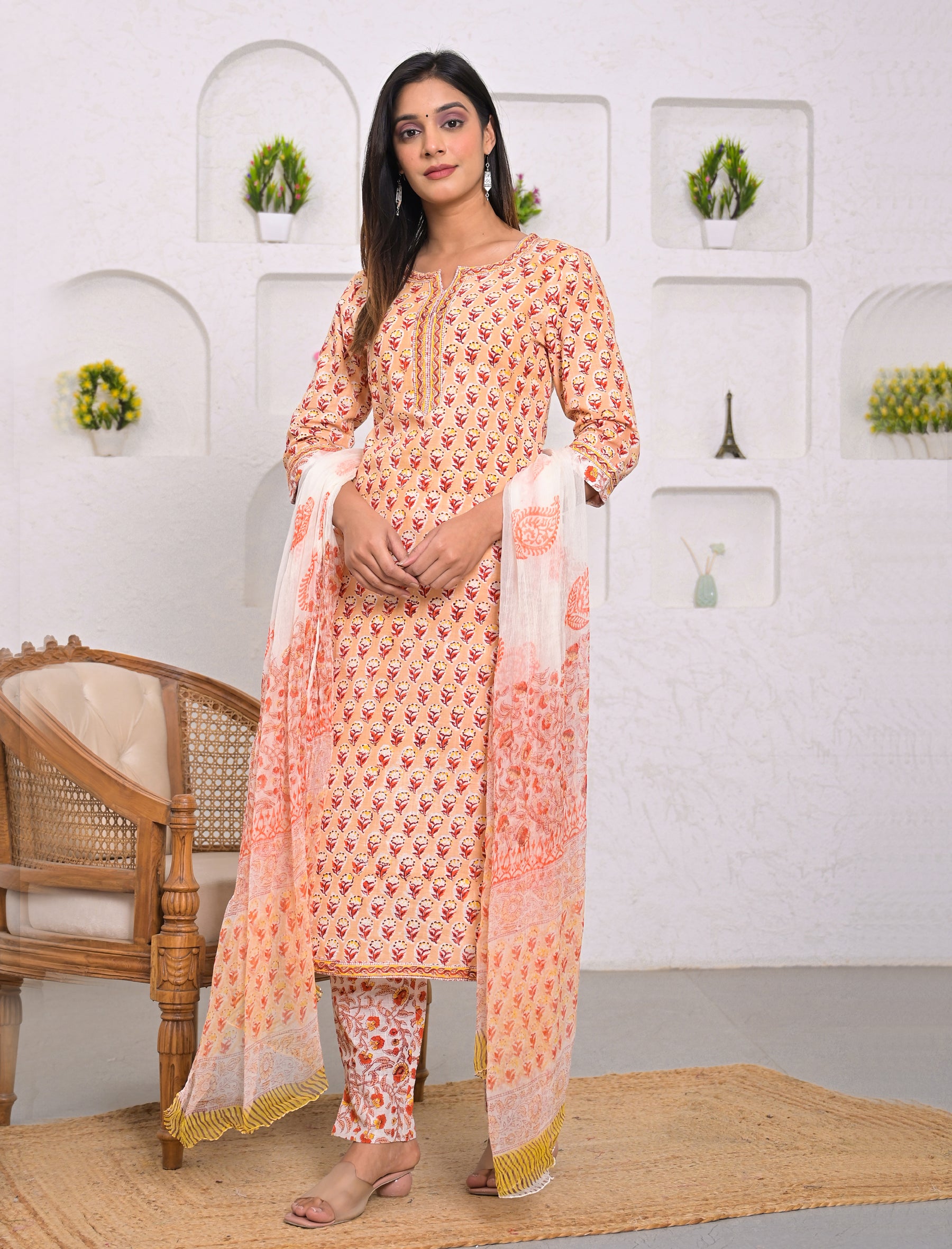 This printed ethnic wear kurta set is presented to you by Gulabchand Prints, A well-known brand in hand block prints from over 9 decades. This exclusively hand stitched kurta set is made of 100% pure cotton fabric with having printed prints over it. The kurta set is best suitable for you to showcase your women hood. Wear this at your ease and the fabric is so smooth to skin that you will love it and the attractive prints adds more charm to the same.