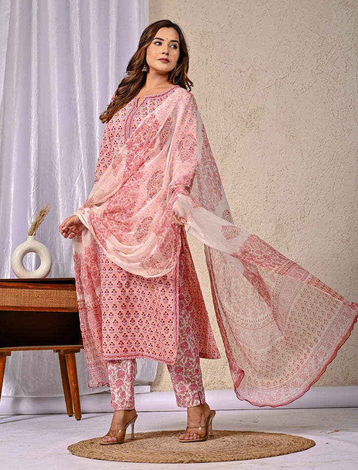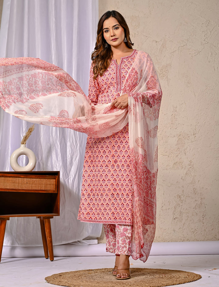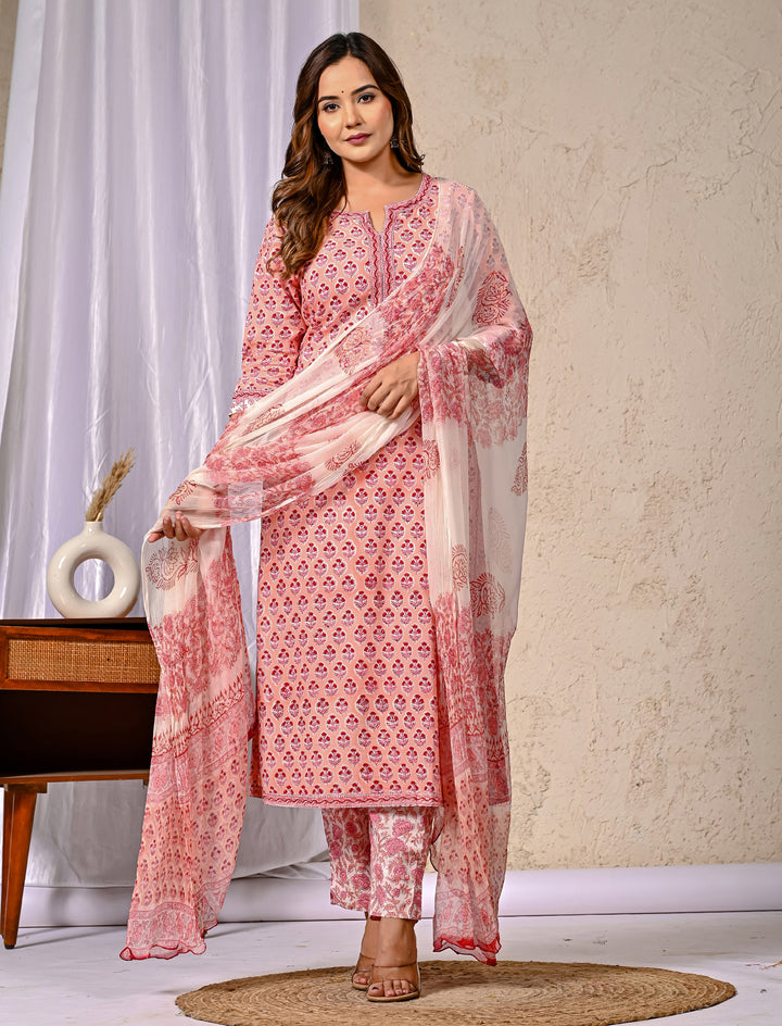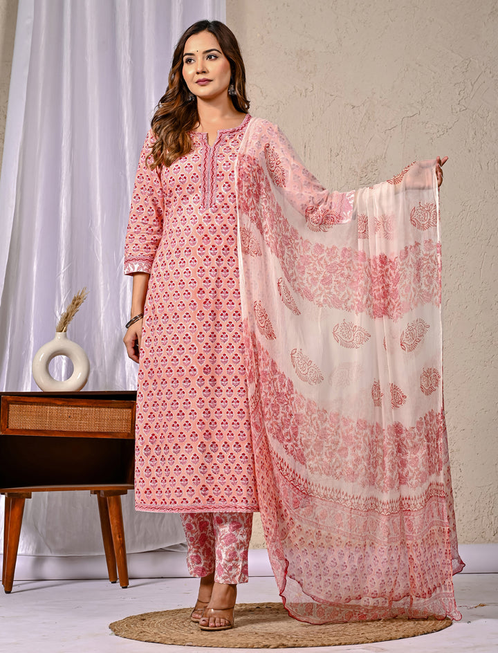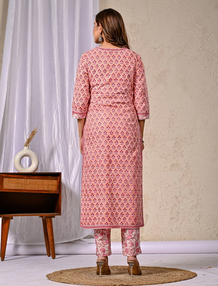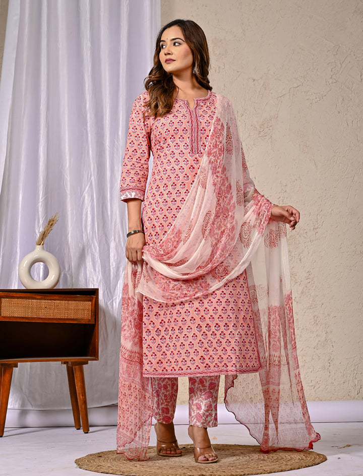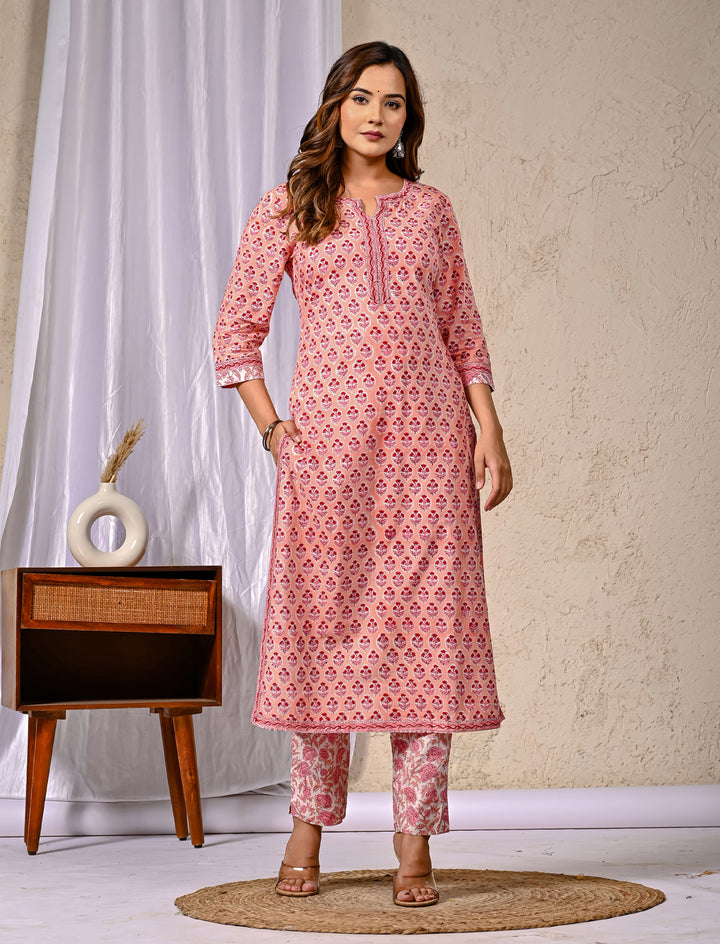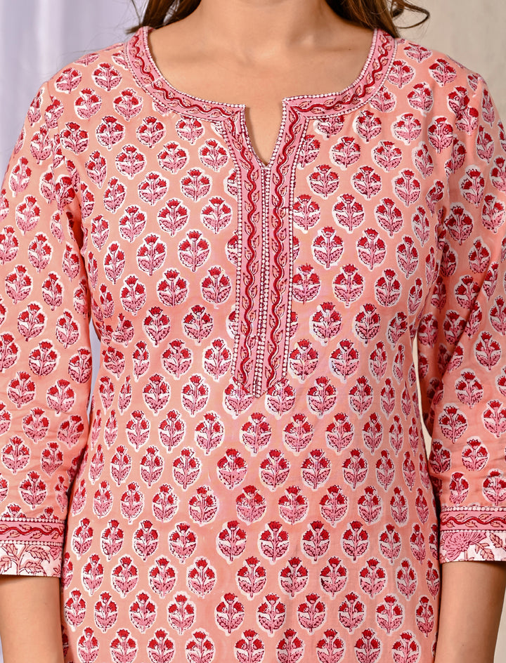 Peach Block Printed Cotton Kurta Pant Set