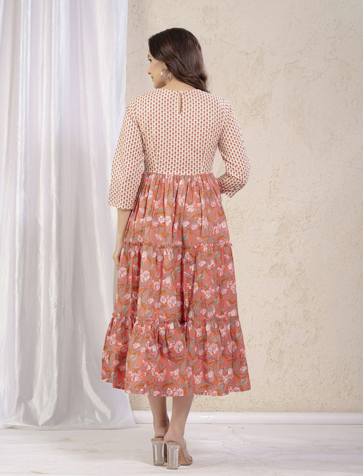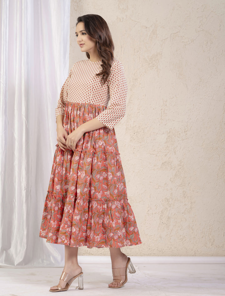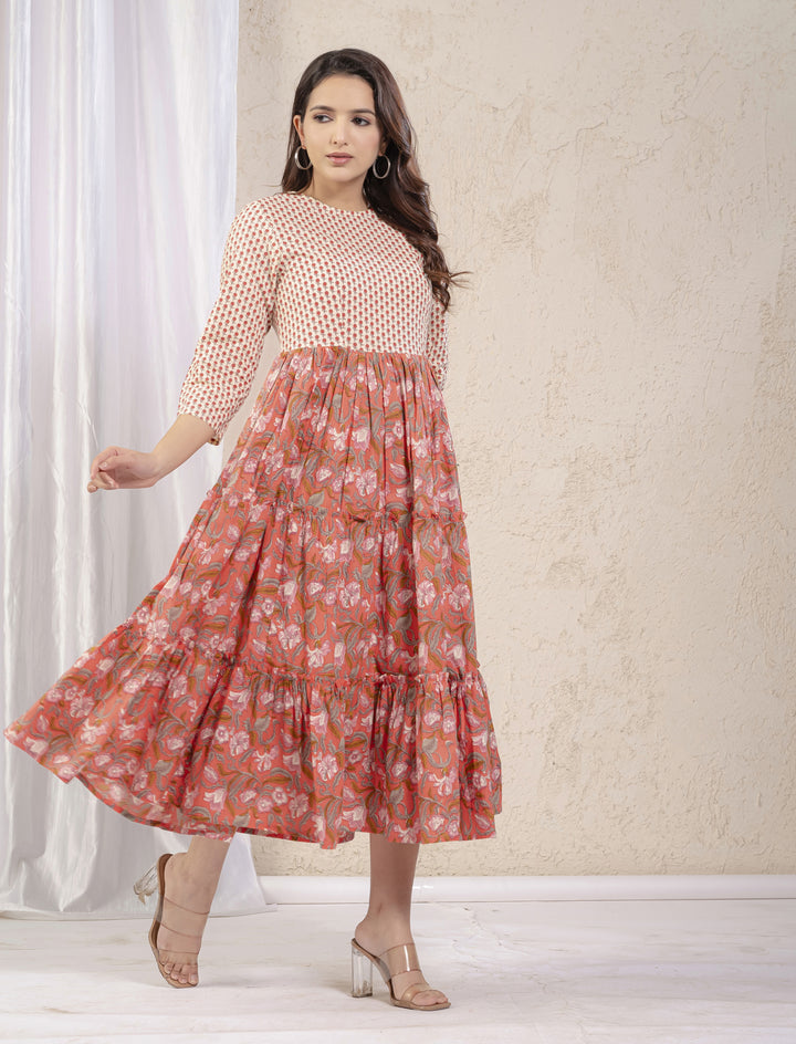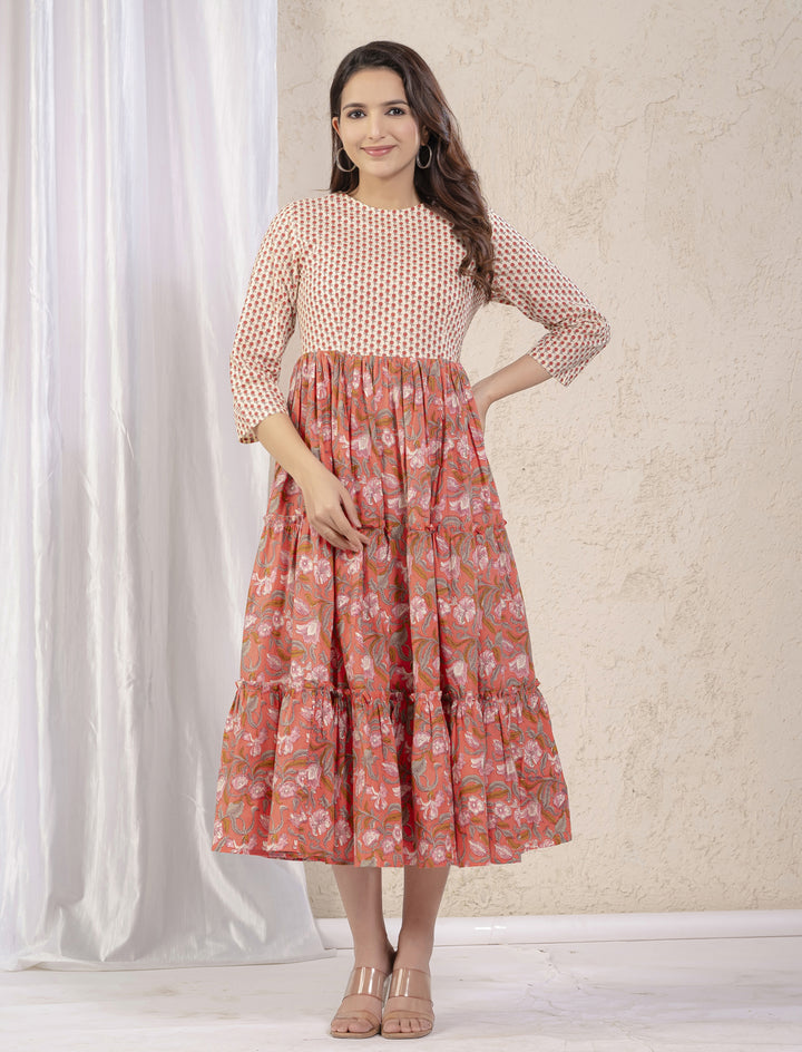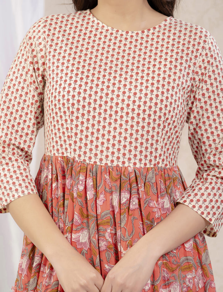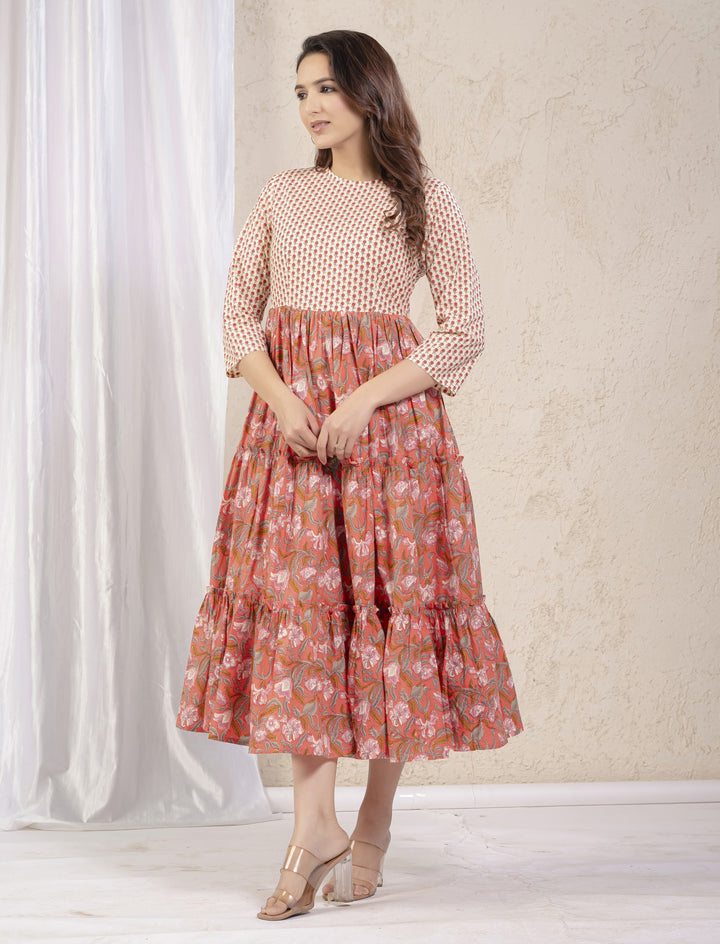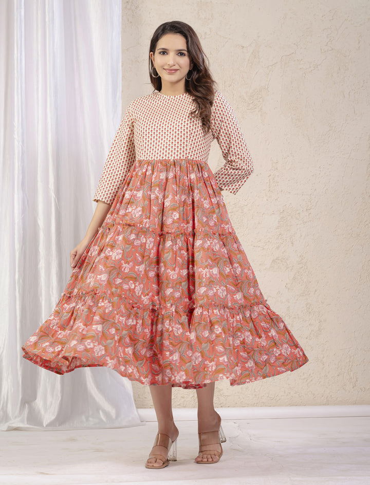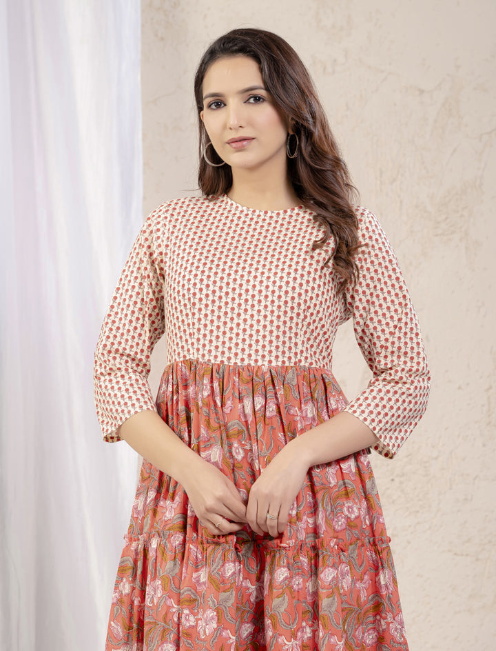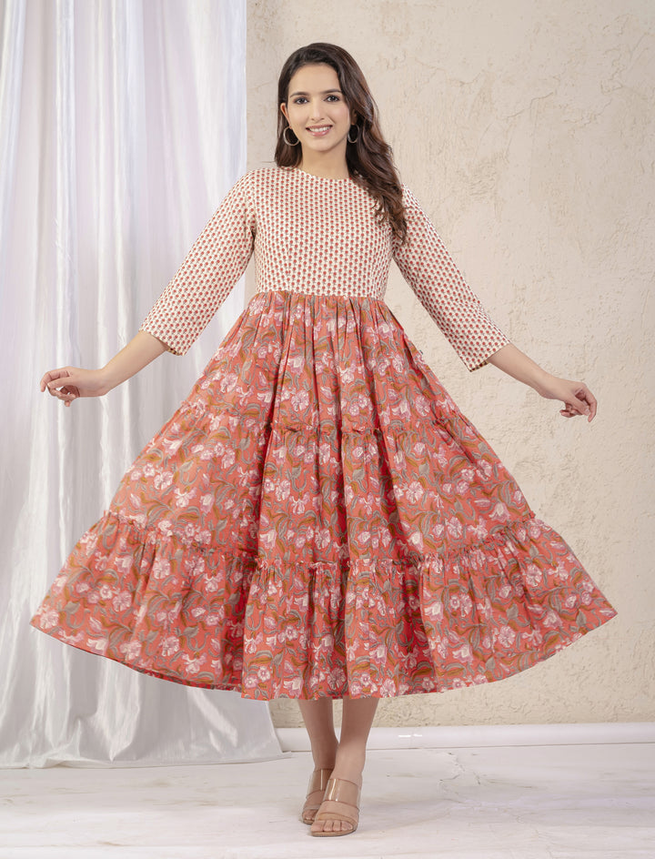 This printed ethnic wear dress is presented to you by Gulabchand Prints, A well-known brand in hand block prints from over 9 decades. This exclusively hand stitched dress is made of 100% pure cotton fabric with having printed prints over it. The dress is best suitable for you to showcase your women hood. Wear this at your ease and the fabric is so smooth to skin that you will love it and the attractive prints adds more charm to the same.
