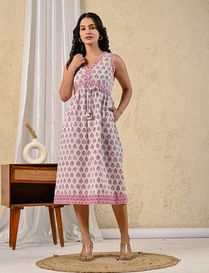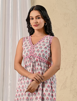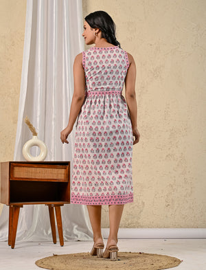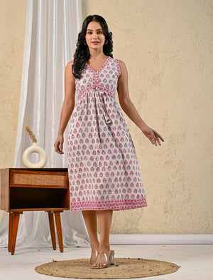 White Pink Butti Block Printed Mulmul Cotton Dress