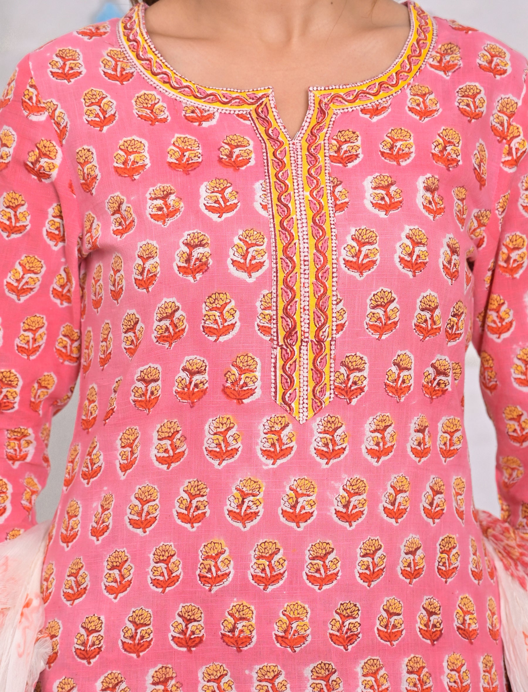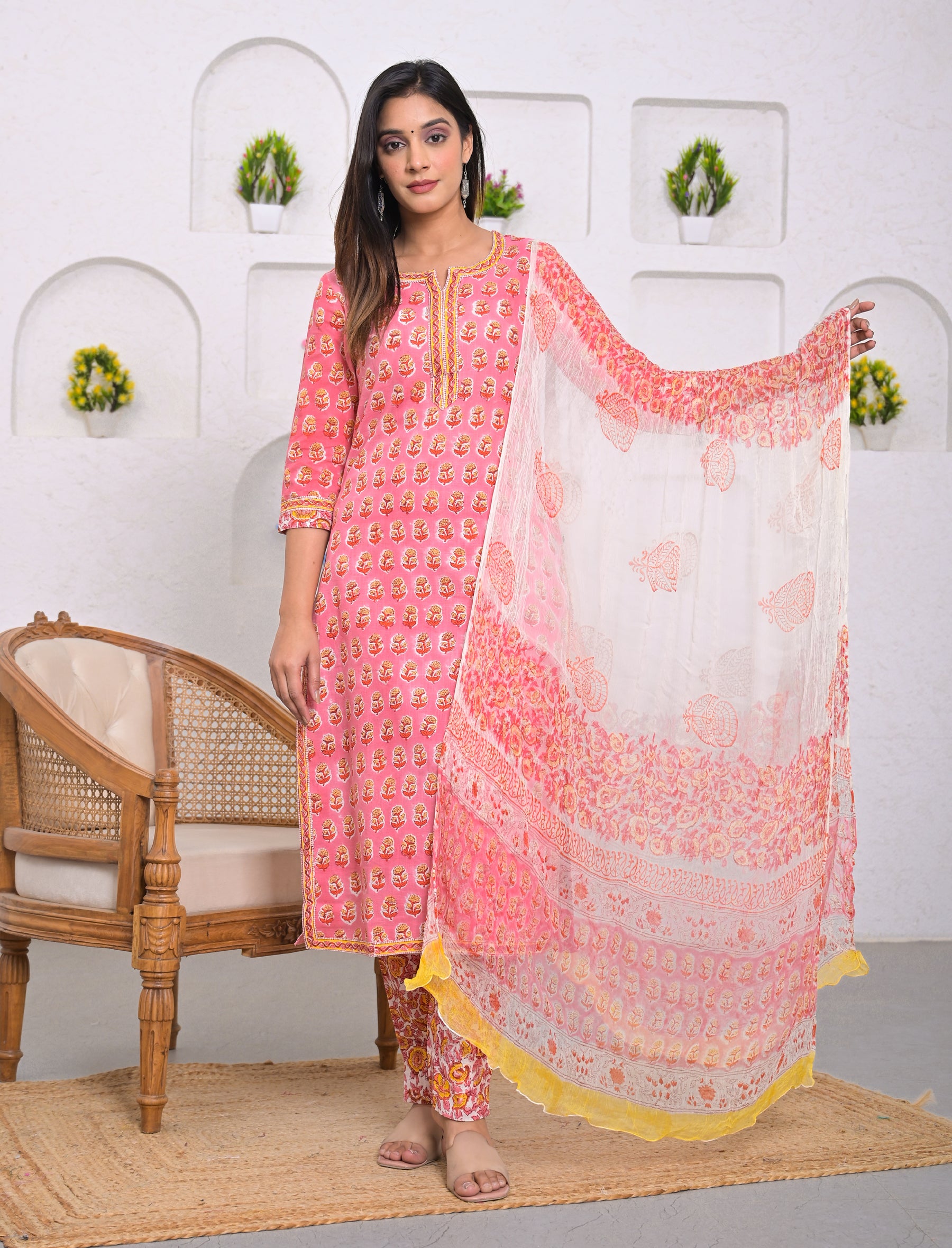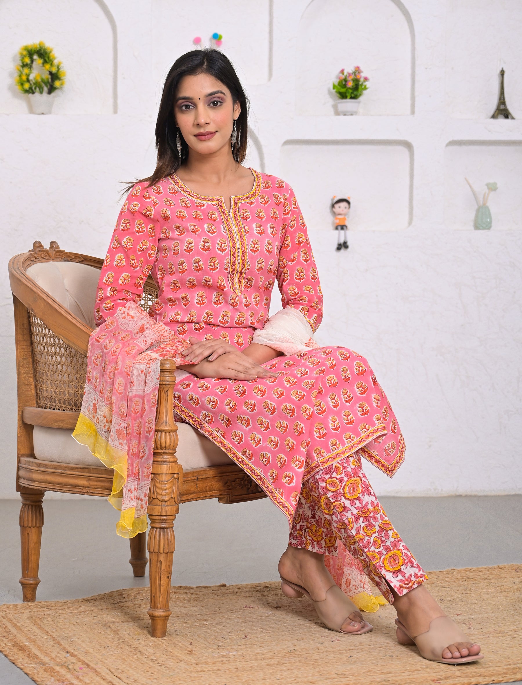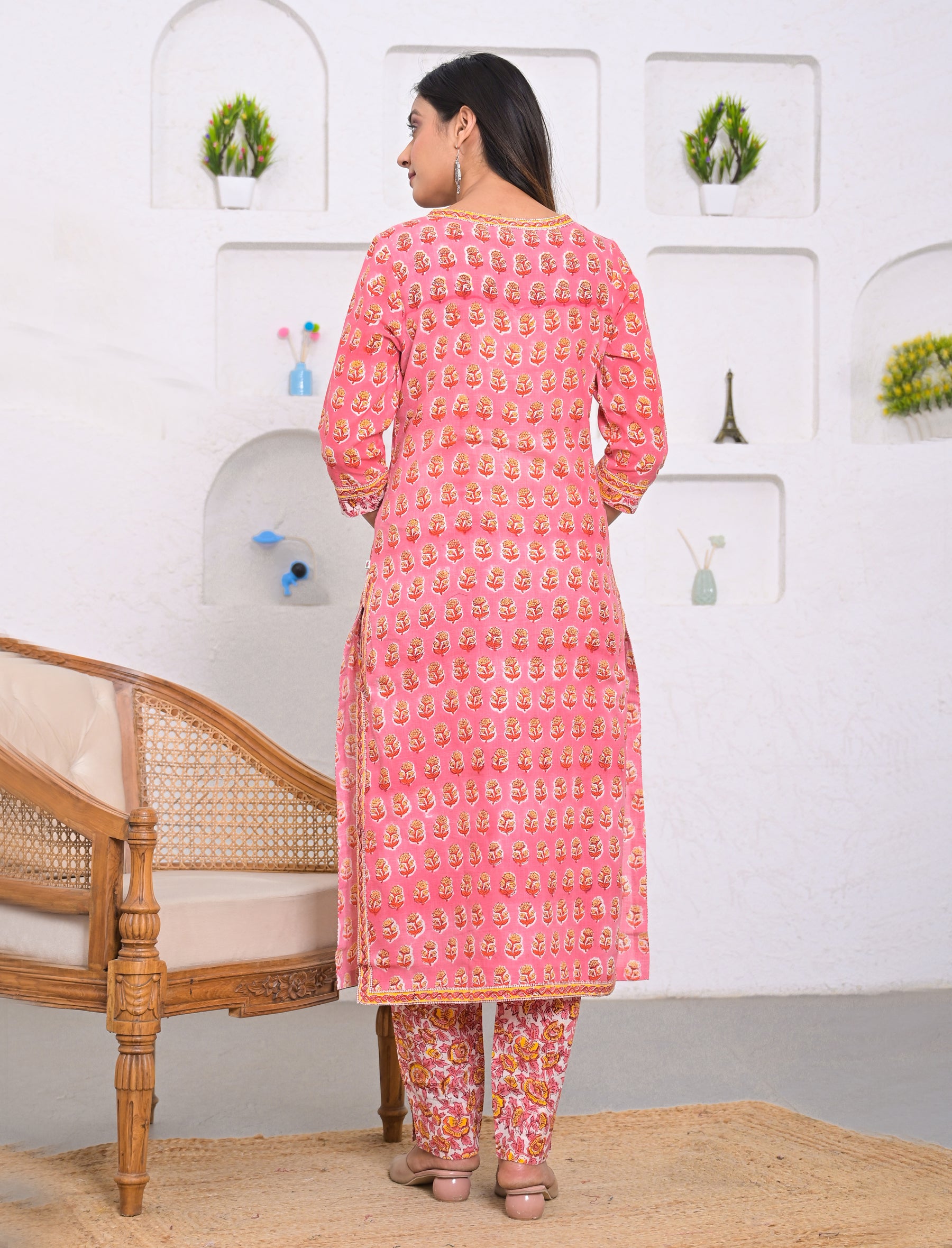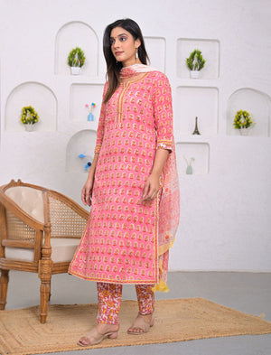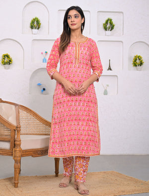 This printed ethnic wear kurta set is presented to you by Gulabchand Prints, A well-known brand in hand block prints from over 9 decades. This exclusively hand stitched kurta set is made of 100% pure cotton fabric with having printed prints over it. The kurta set is best suitable for you to showcase your women hood. Wear this at your ease and the fabric is so smooth to skin that you will love it and the attractive prints adds more charm to the same.