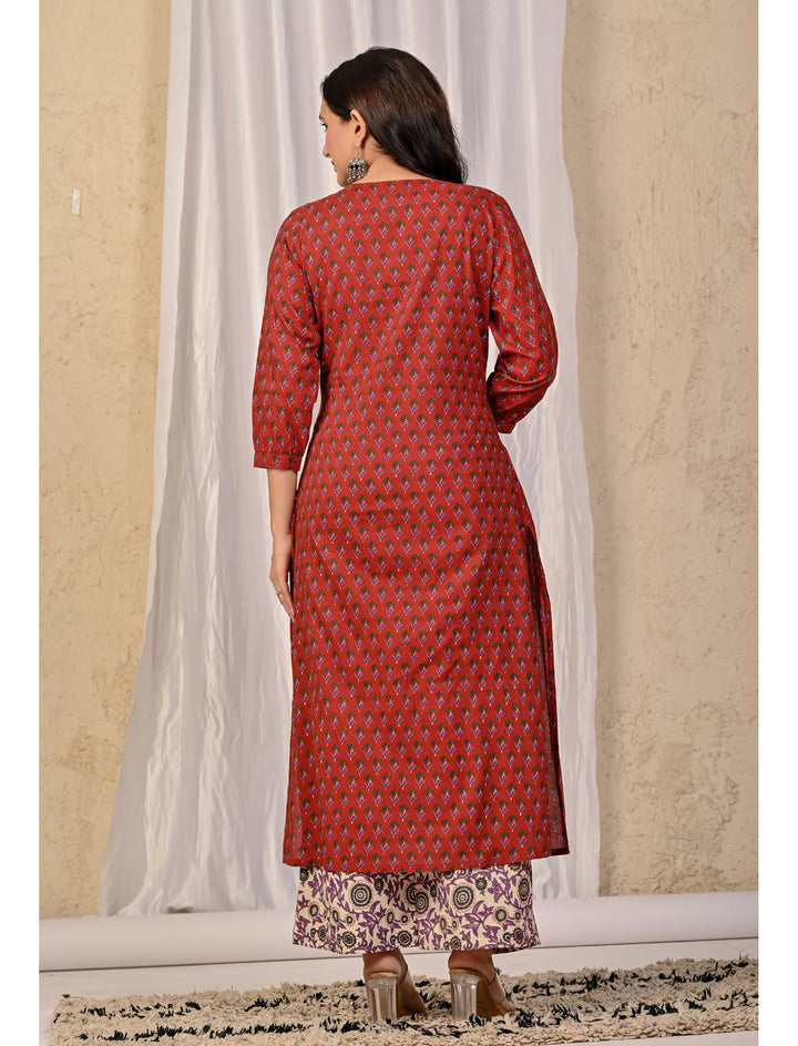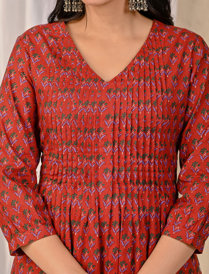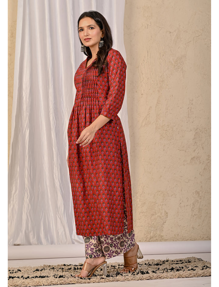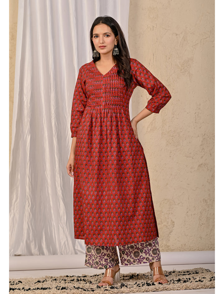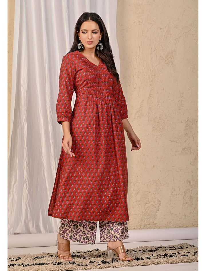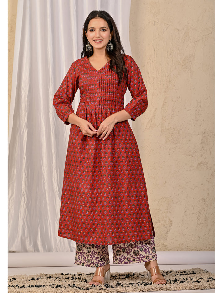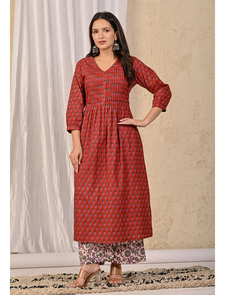 This printed ethnic wear kurta set is presented to you by Gulabchand Prints, A well-known brand in hand block prints from over 9 decades. This exclusively hand stitched kurta set is made of 100% pure cotton fabric with having printed prints over it. The kurta set is best suitable for you to showcase your women hood. Wear this at your ease and the fabric is so smooth to skin that you will love it and the attractive prints adds more charm to the same.