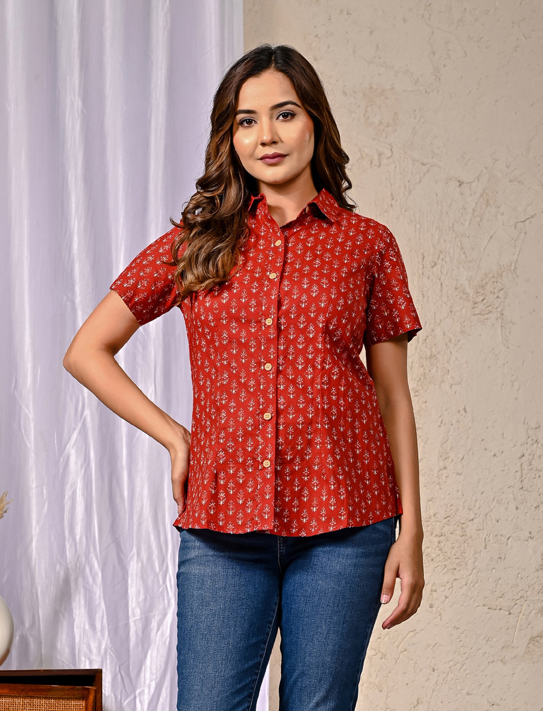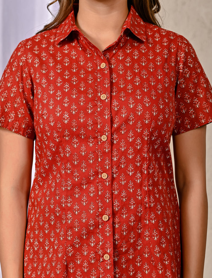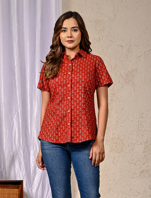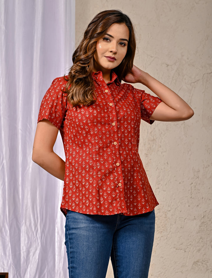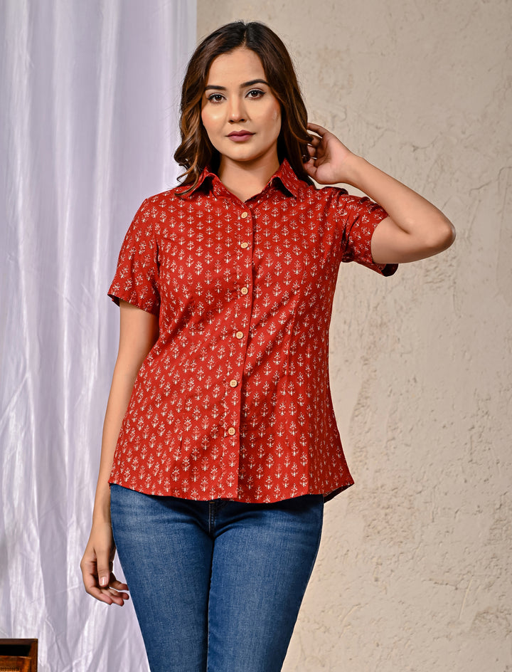Red Cotton Printed Half Sleeves Shirt For Women