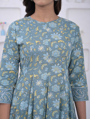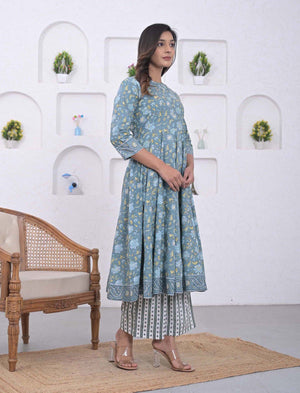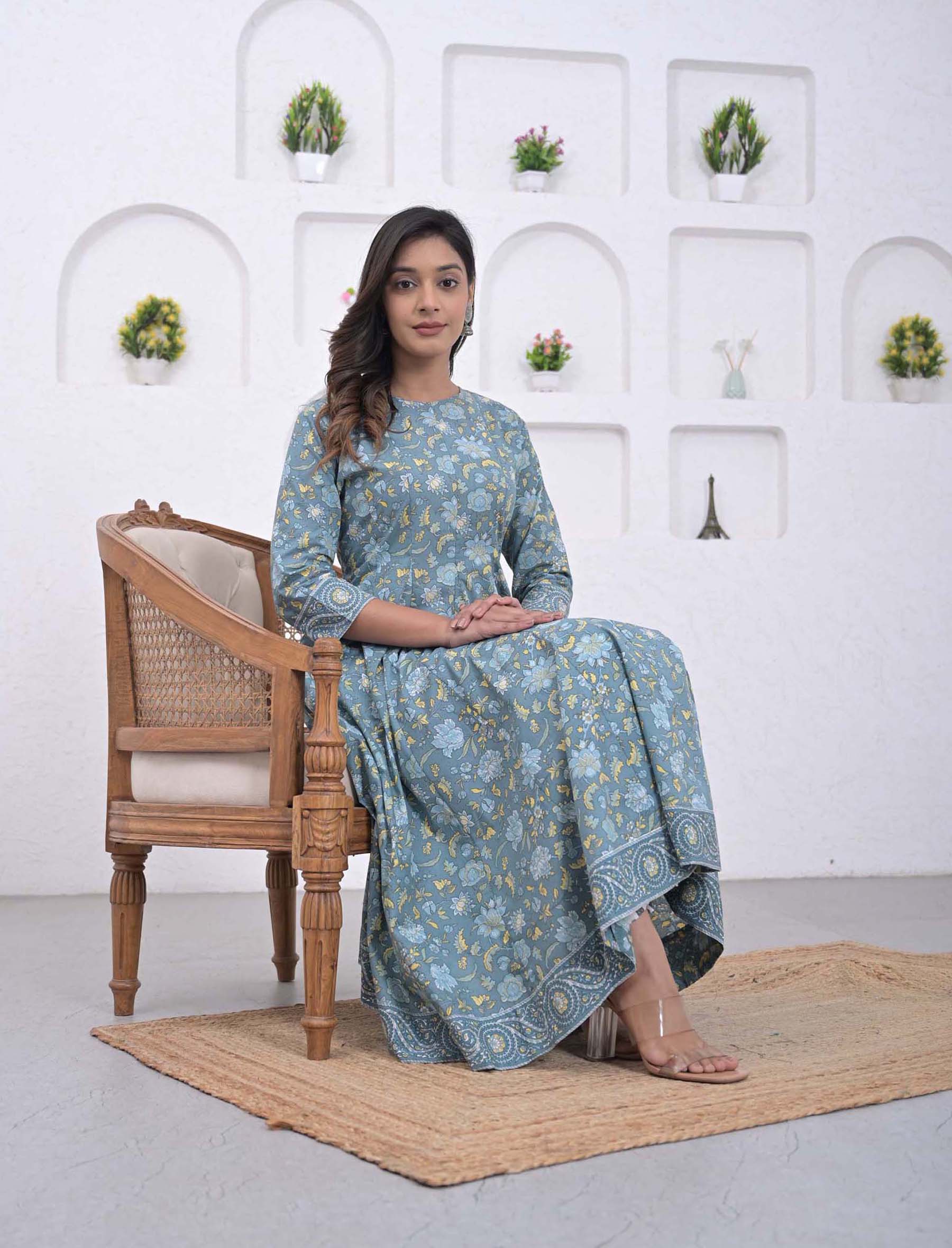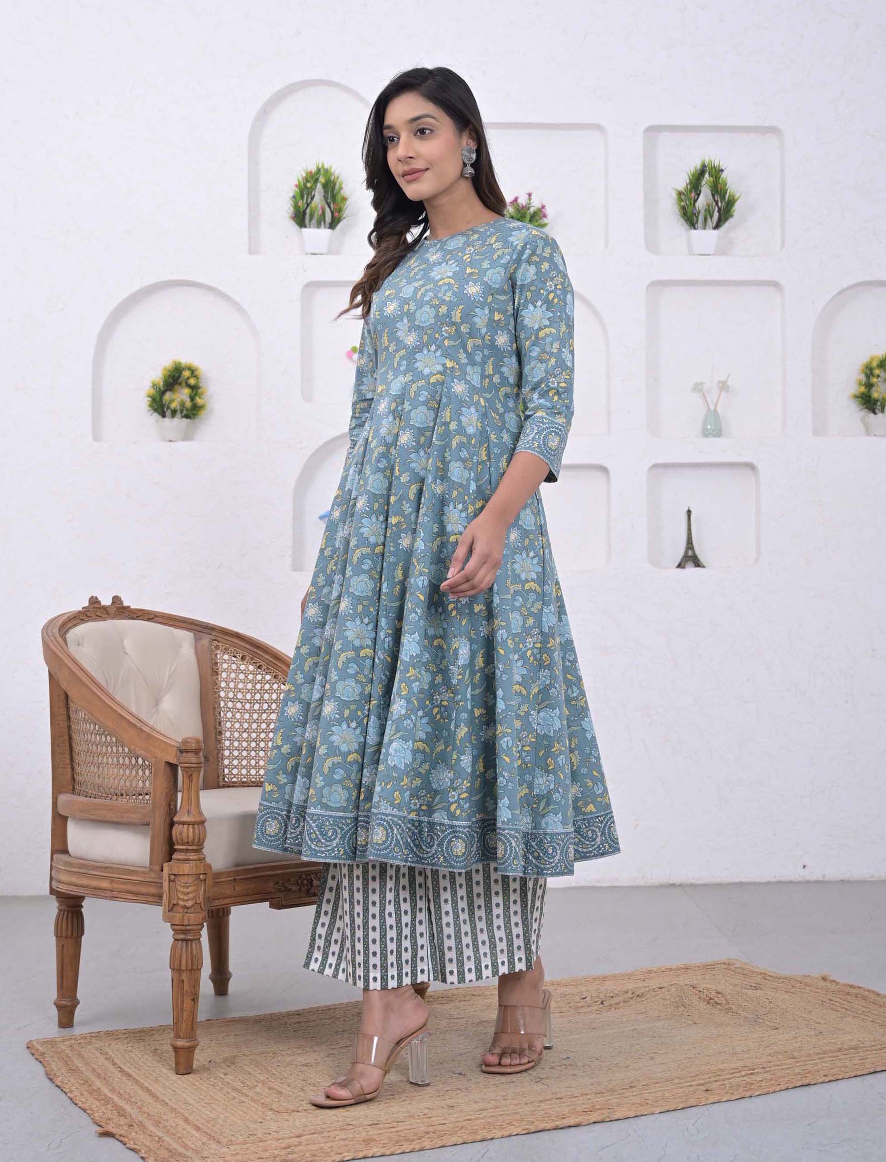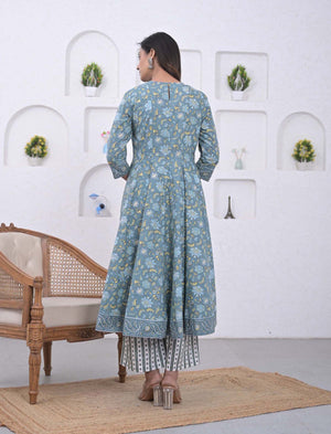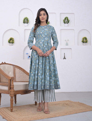 This printed ethnic wear kurta set is presented to you by Gulabchand Prints, A well-known brand in hand block prints from over 9 decades. This exclusively hand stitched kurta set is made of 100% pure cotton fabric with having printed prints over it. The kurta set is best suitable for you to showcase your women hood. Wear this at your ease and the fabric is so smooth to skin that you will love it and the attractive prints adds more charm to the same.