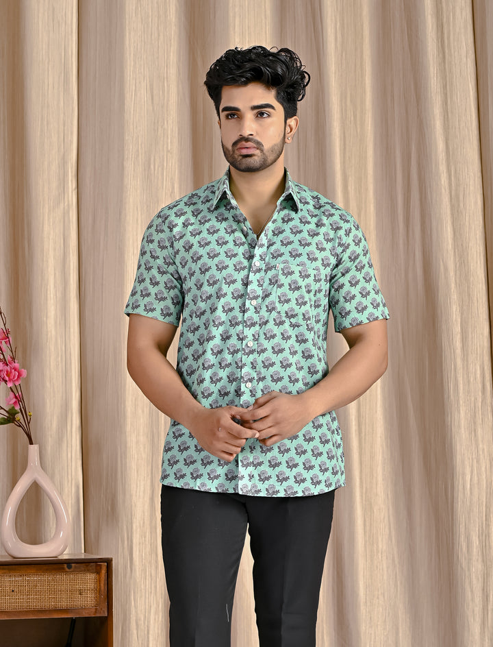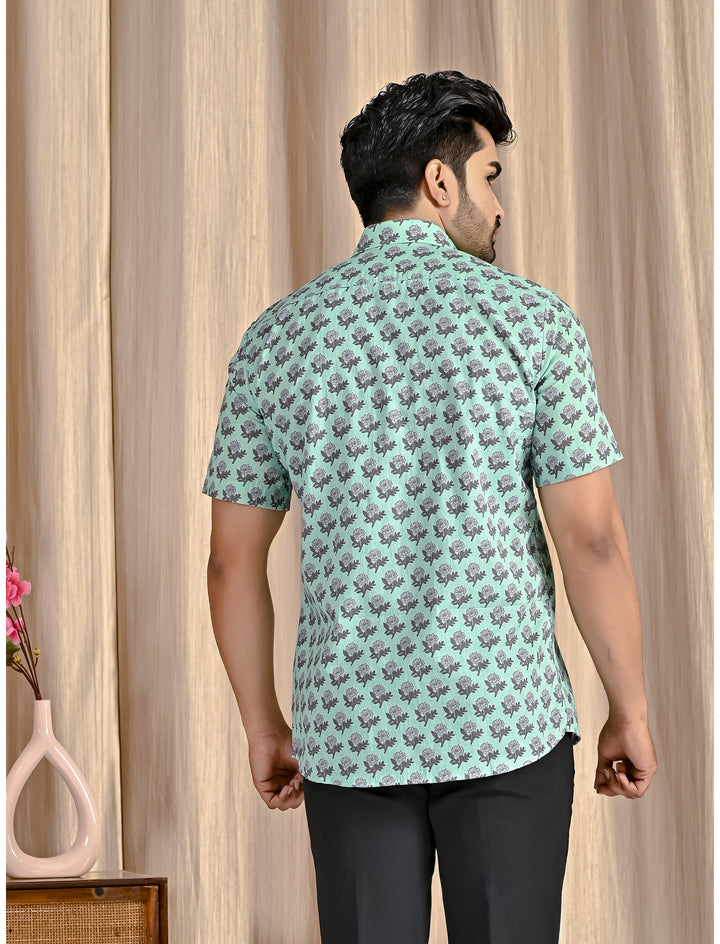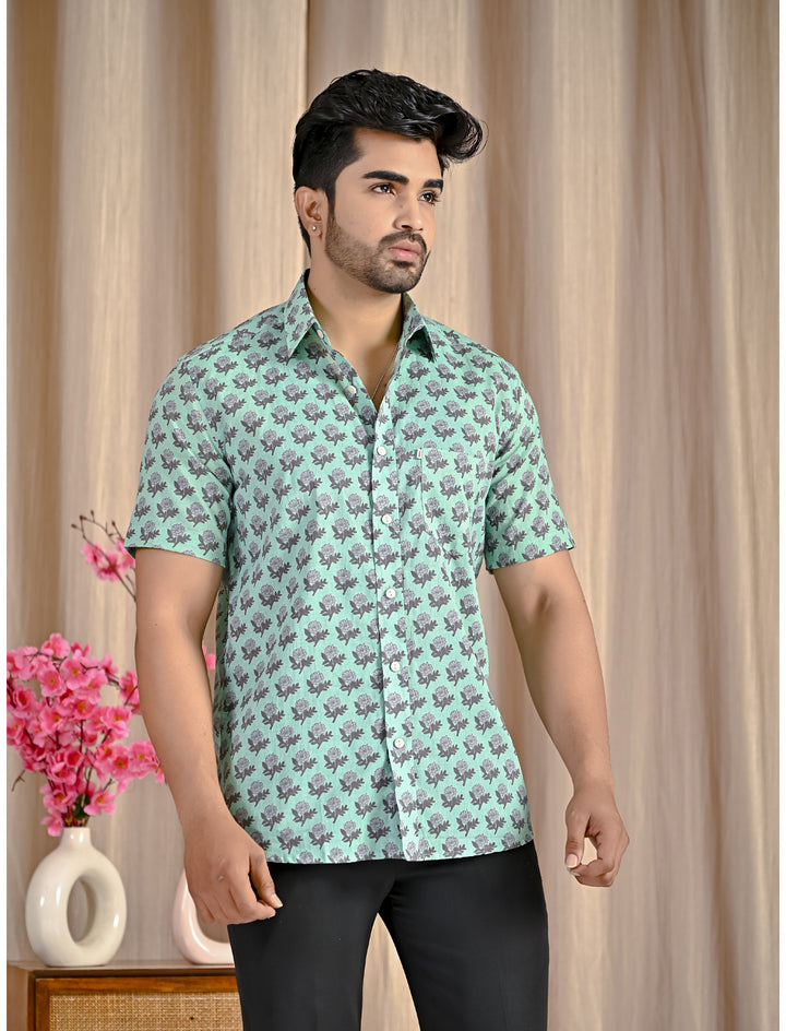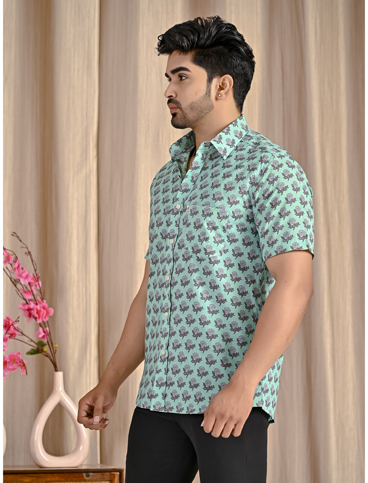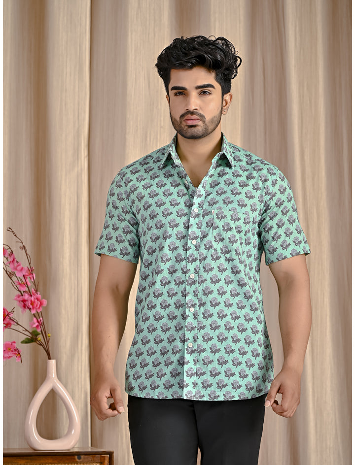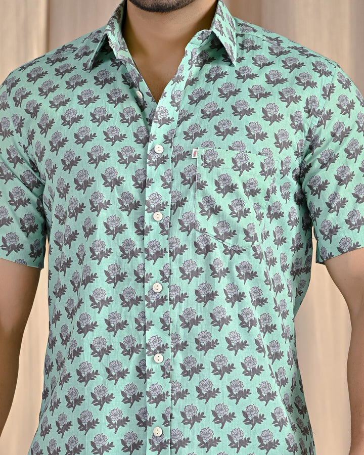 Turquoise Cotton Printed Half Sleeves Shirt