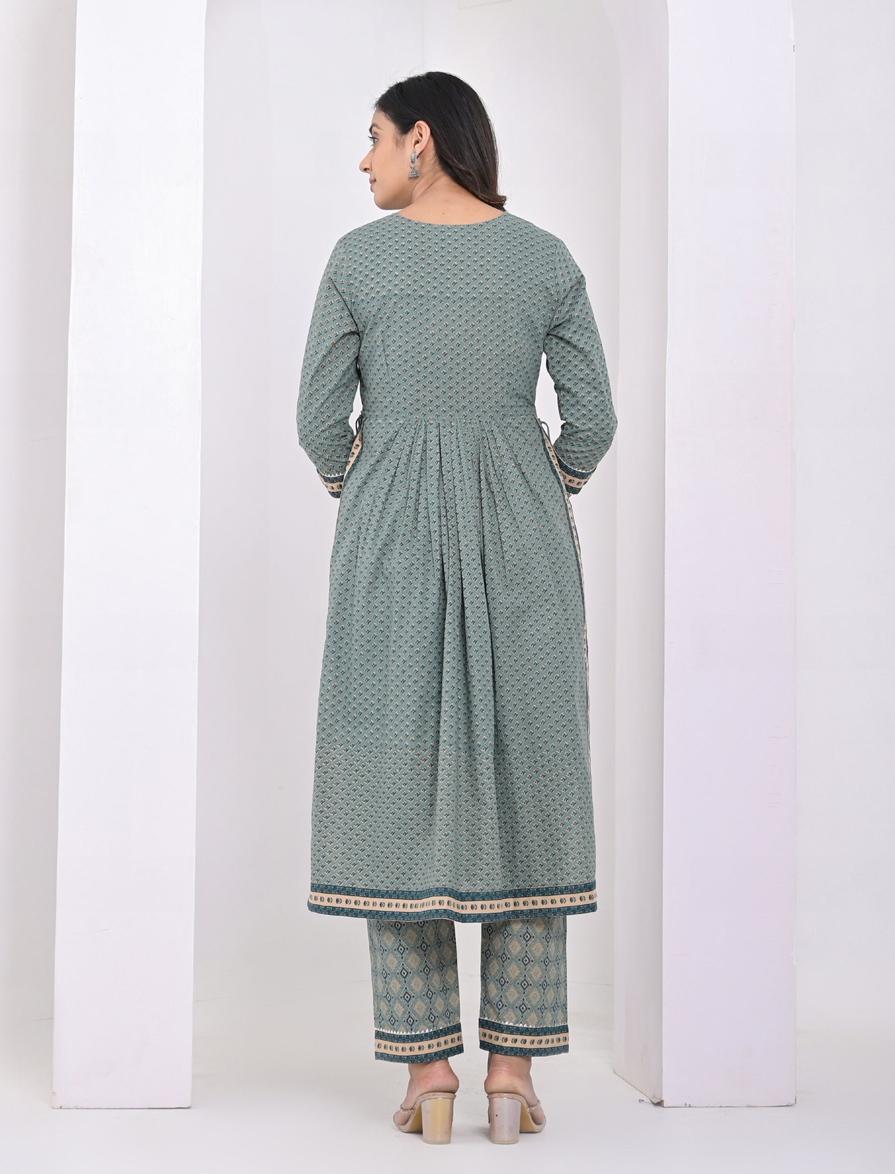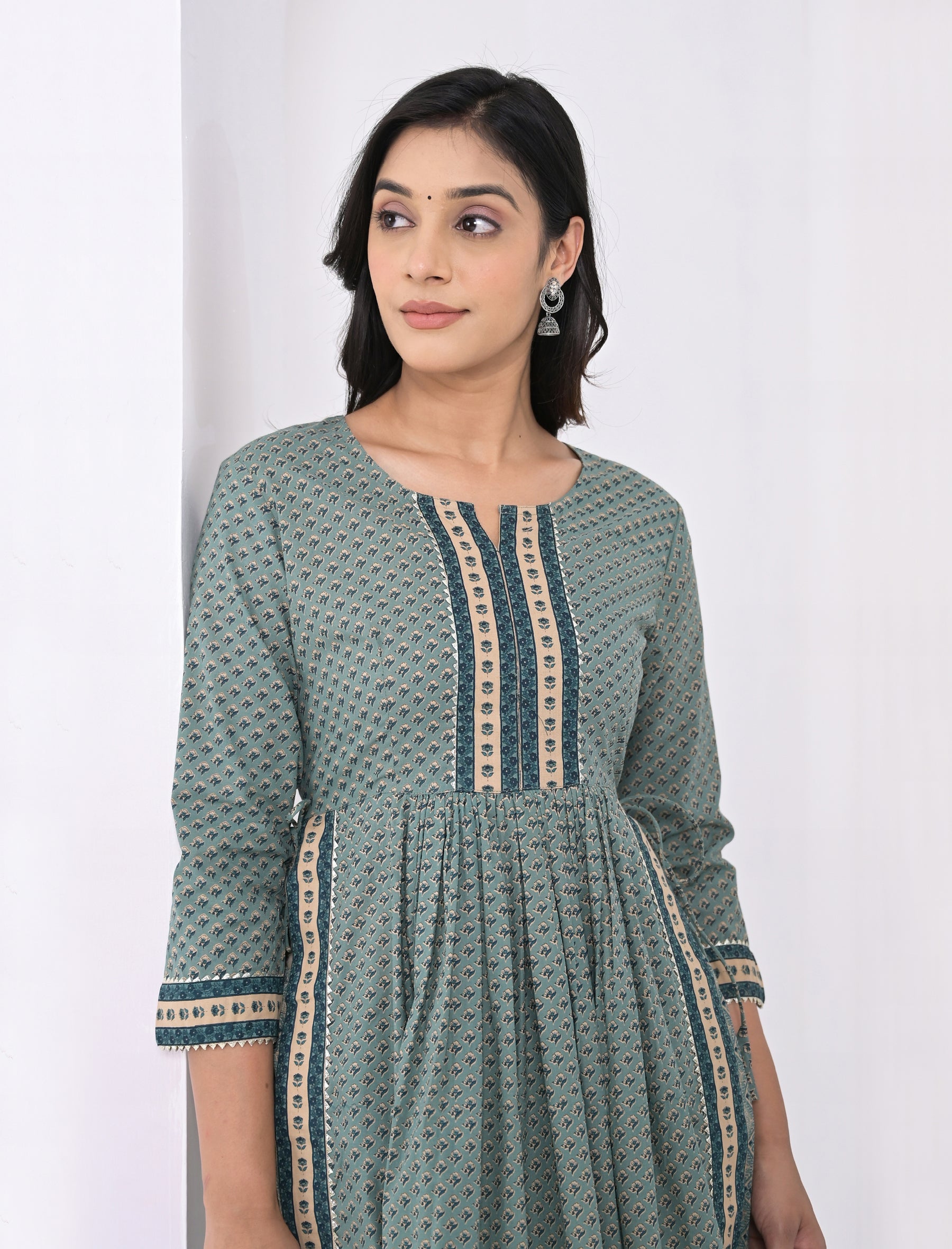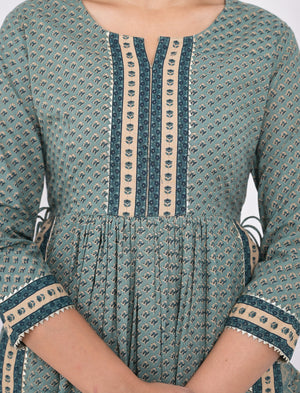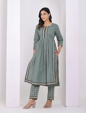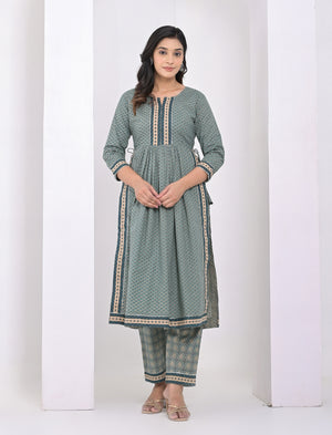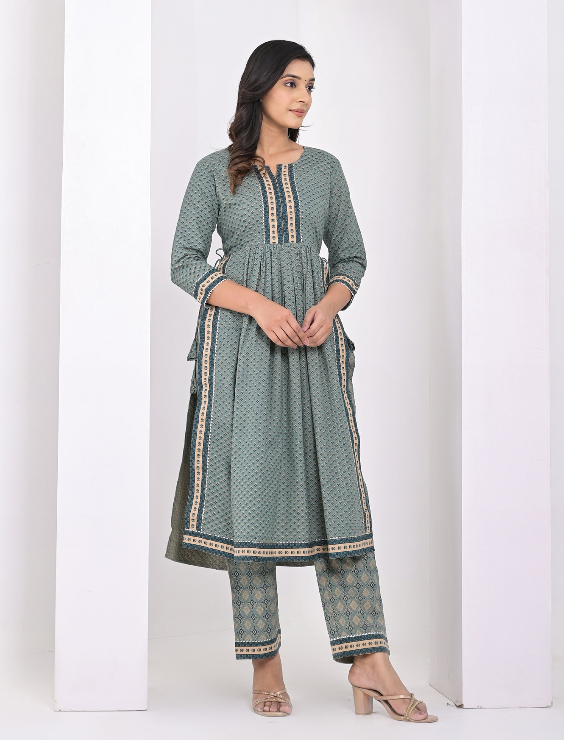 This printed ethnic wear kurta set is presented to you by Gulabchand Prints, A well-known brand in hand block prints from over 9 decades. This exclusively hand stitched kurta set is made of 100% pure cotton fabric with having printed prints over it. The kurta set is best suitable for you to showcase your women hood. Wear this at your ease and the fabric is so smooth to skin that you will love it and the attractive prints adds more charm to the same.