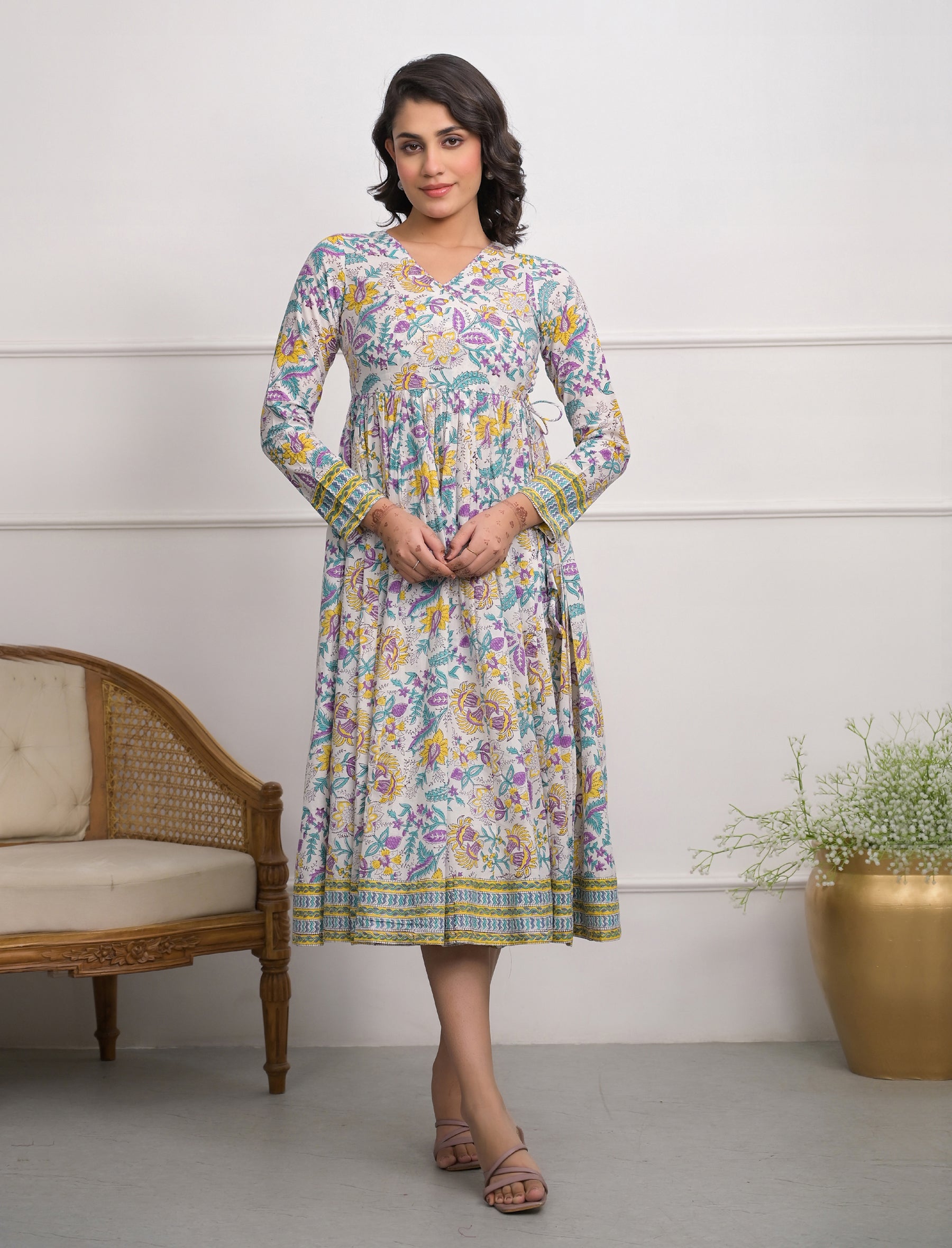 This printed dress is presented to you by Gulabchand Prints, A well-known brand in hand block prints from over 9 decades. This exclusively hand stitched dress is made of 100% pure cotton fabric with having printed prints over it. The dress is best suitable for you to showcase your women hood. Wear this at your ease and the fabric is so smooth to skin that you will love it and the attractive prints adds more charm to the same.