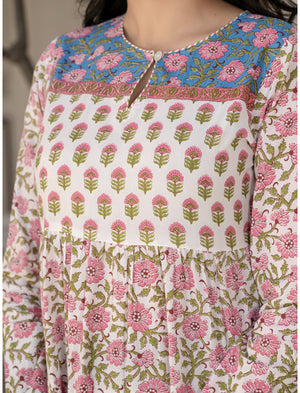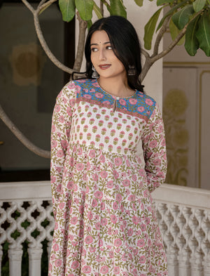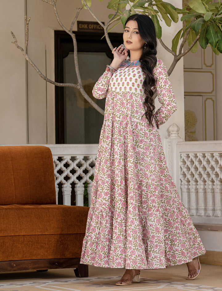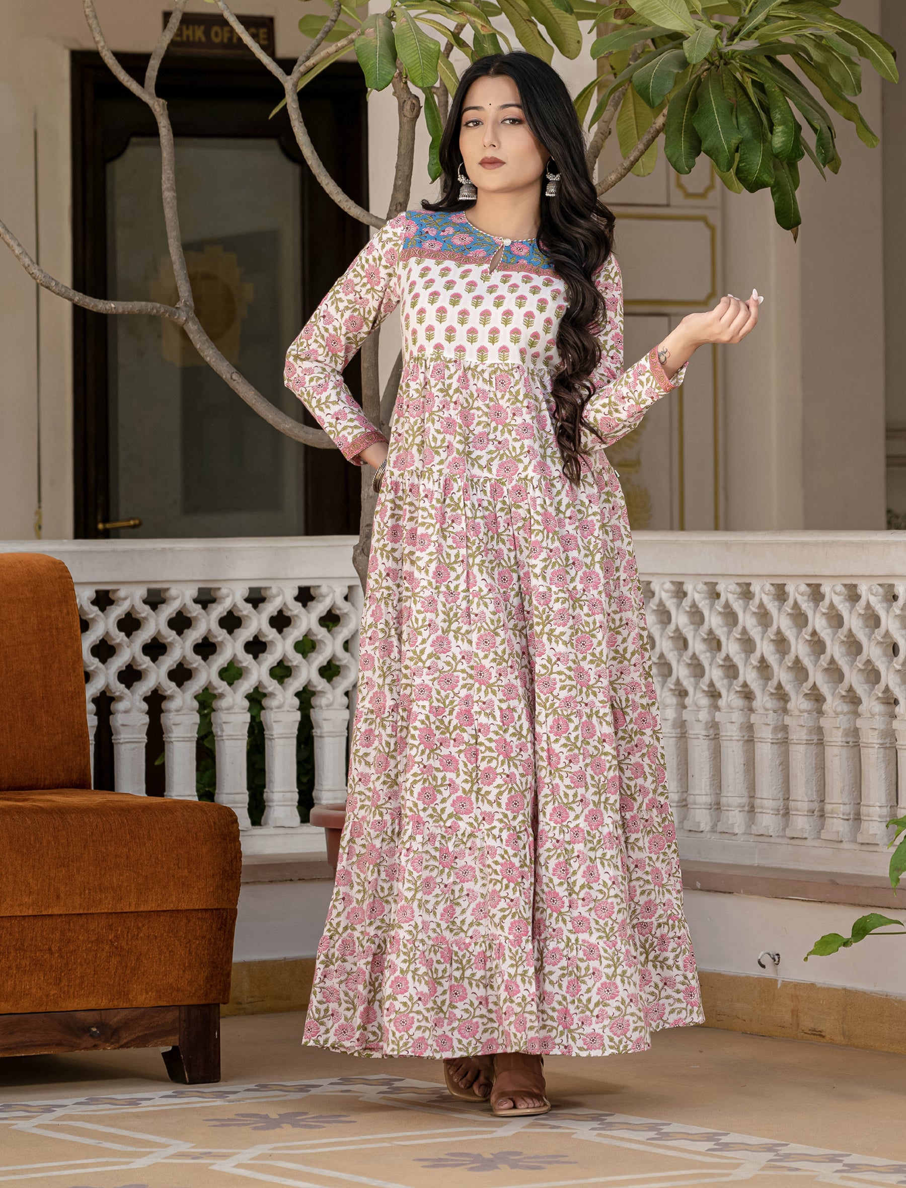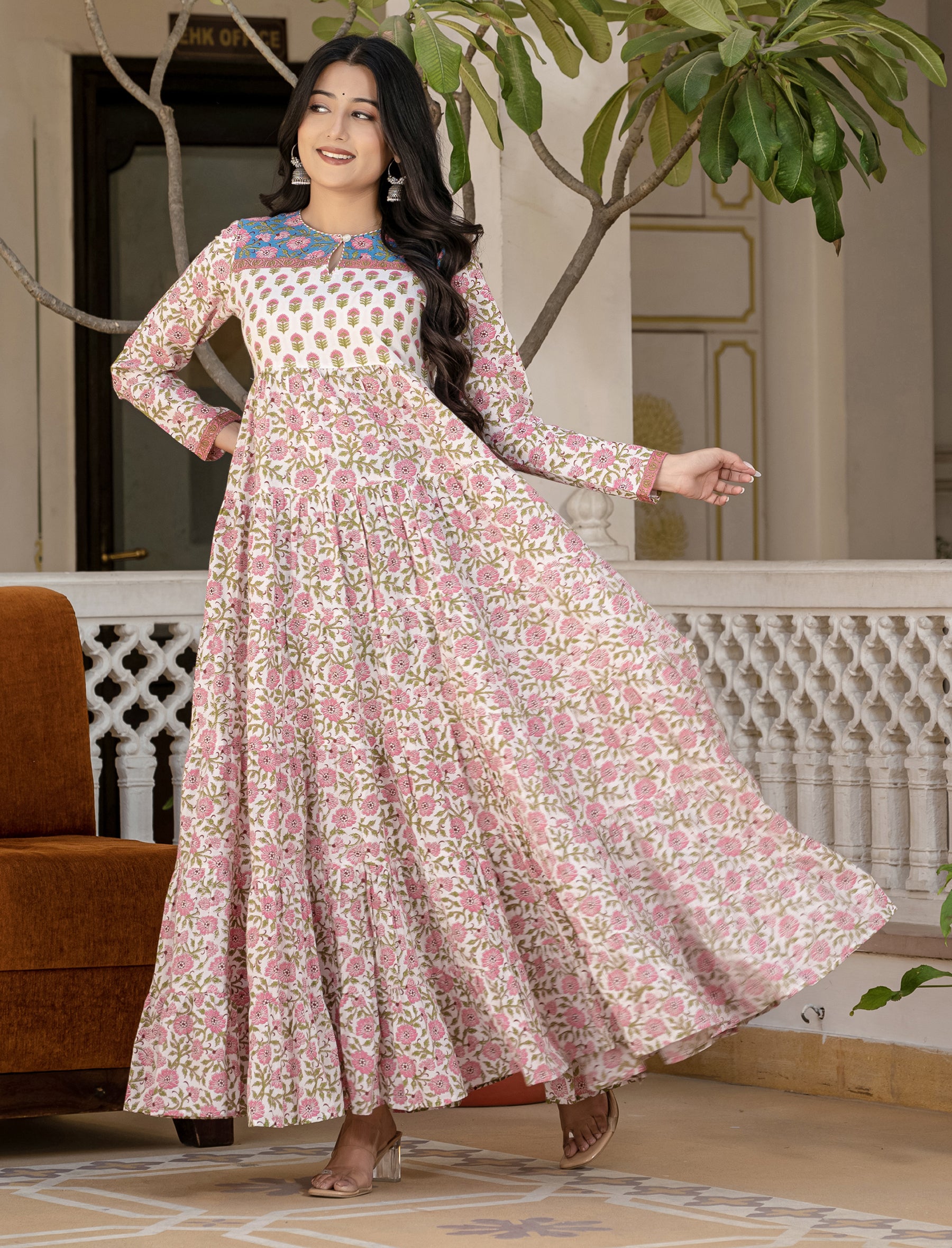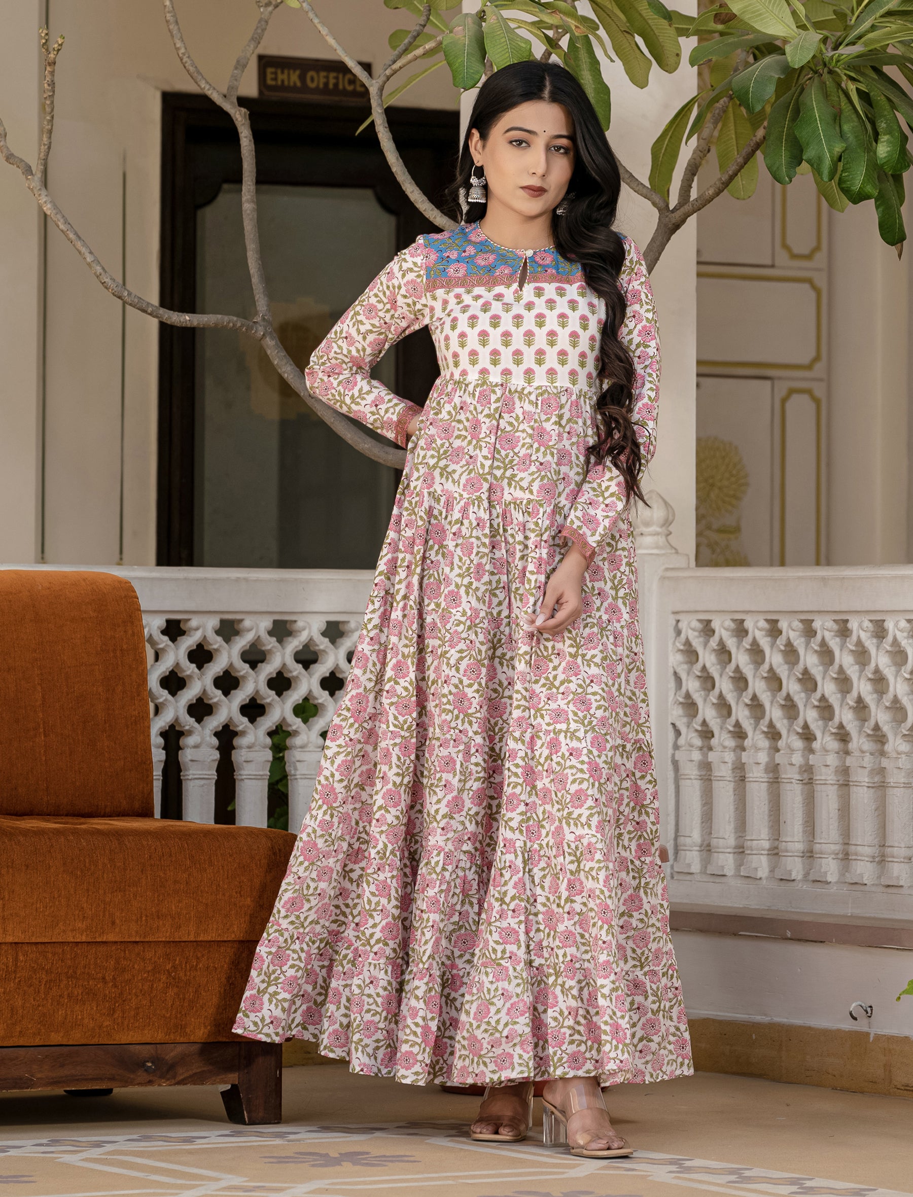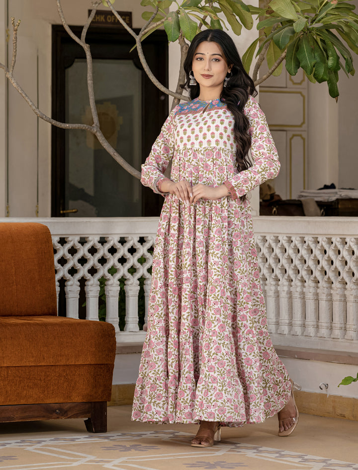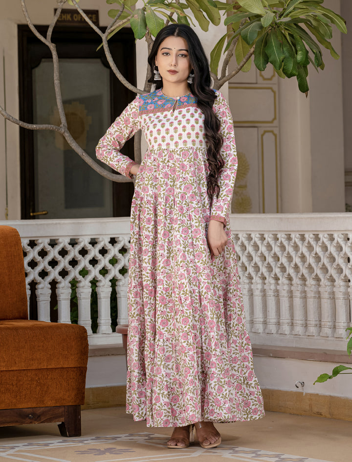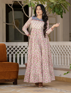 Expertly crafted with traditional prints, this cotton long dress exudes elegance. The stunning design on the yoke adds a touch of sophistication, making it perfect for any occasion. With its comfortable fit and beautiful detailing, this dress is a must-have for your wardrobe.