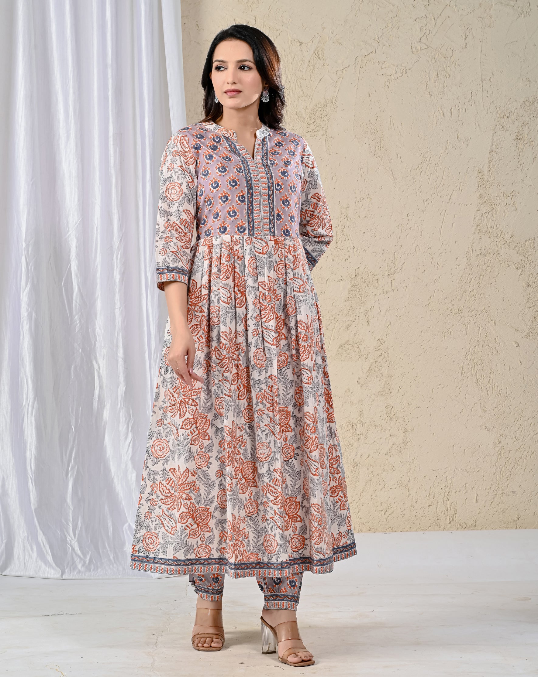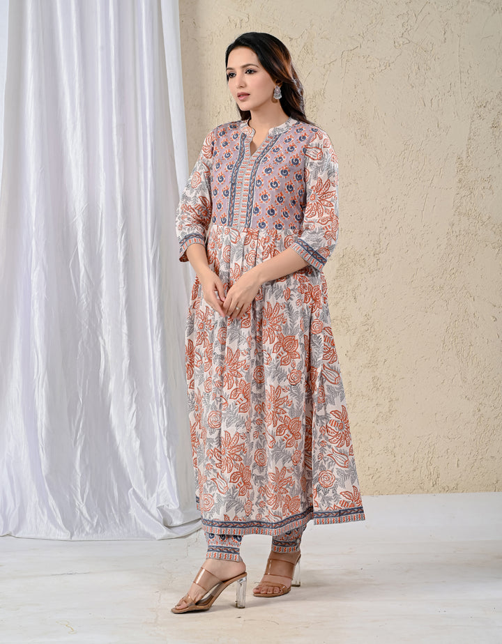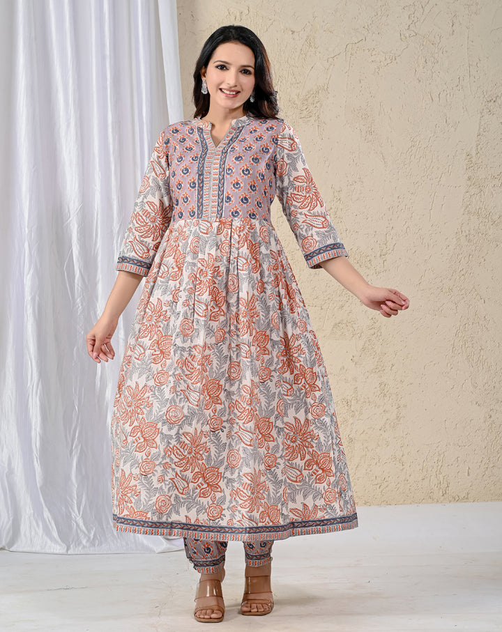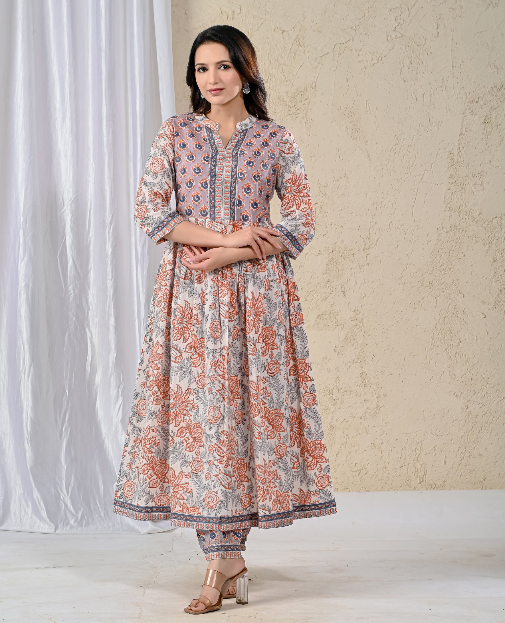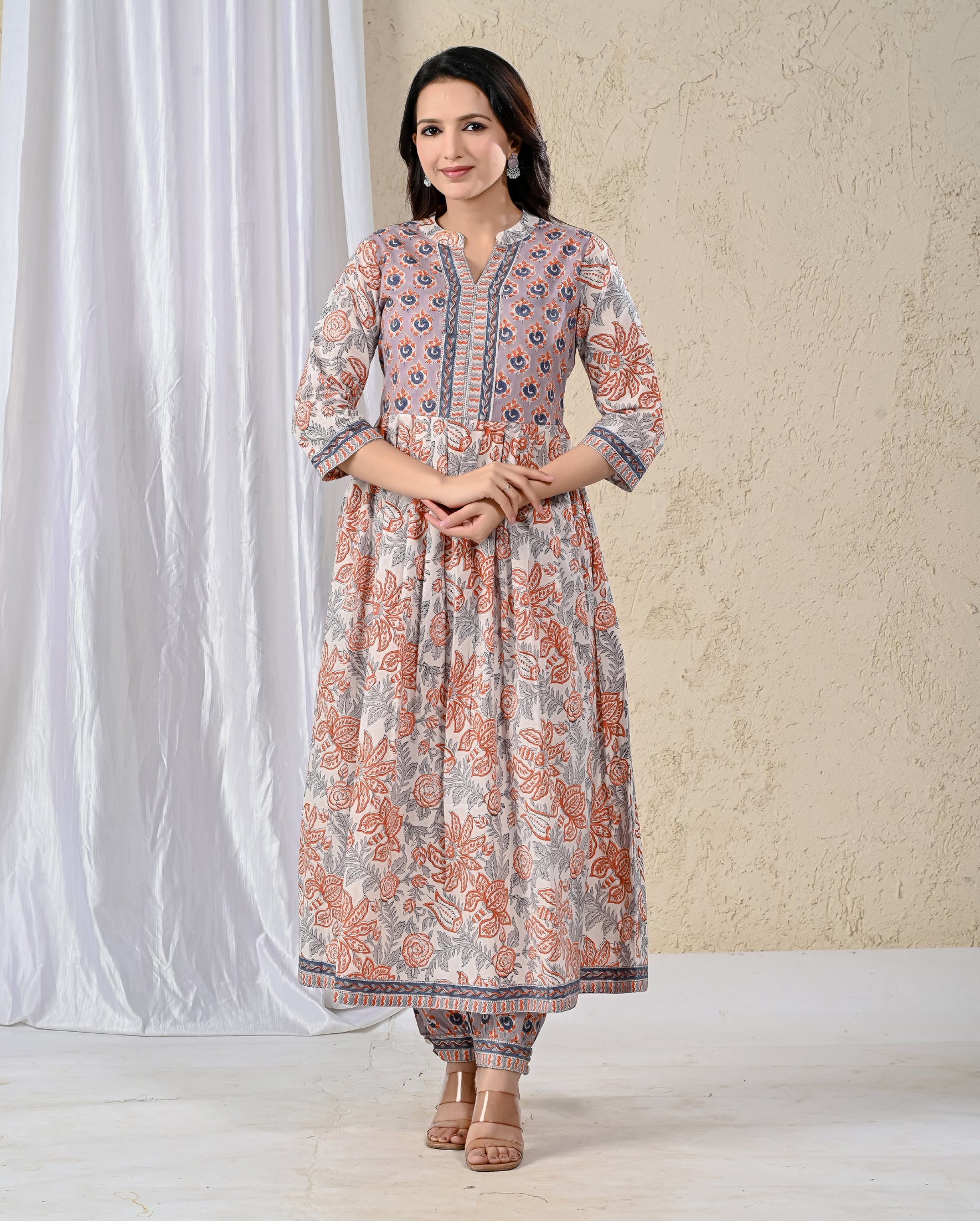 This printed ethnic wear kurta set is presented to you by Gulabchand Prints, A well-known brand in hand block prints from over 9 decades. This exclusively hand stitched kurta set is made of 100% pure cotton fabric with having printed prints over it. The kurta set is best suitable for you to showcase your women hood. Wear this at your ease and the fabric is so smooth to skin that you will love it and the attractive prints adds more charm to the same.