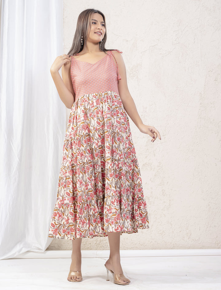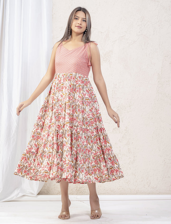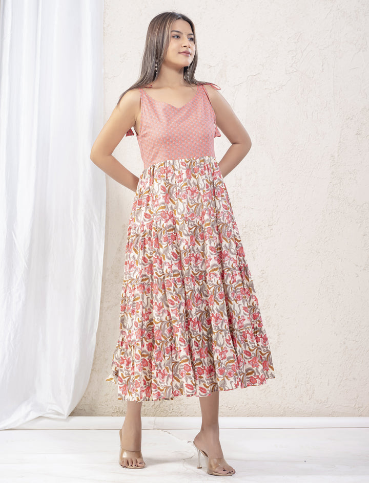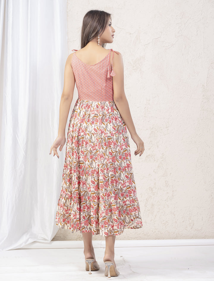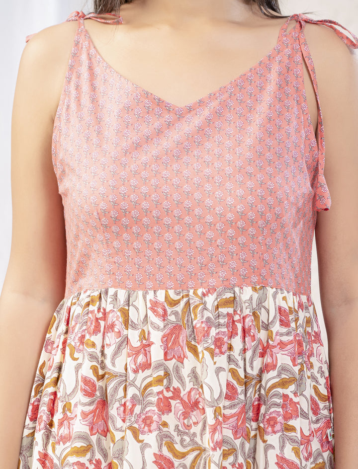 White Pink Jaal Block Printed Cotton Shoulder Strap Dress