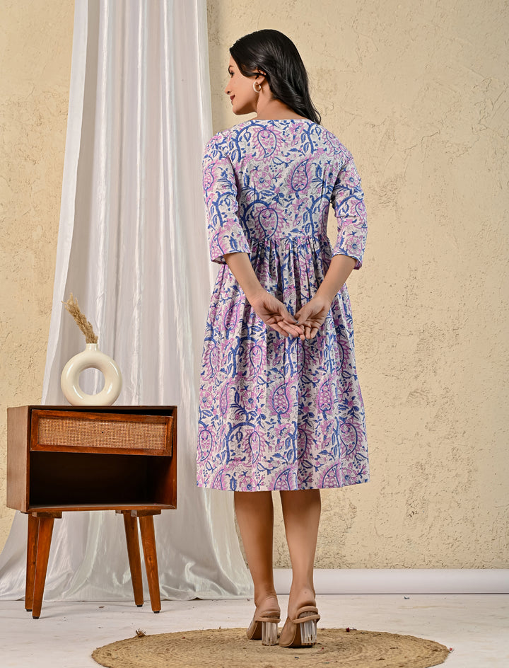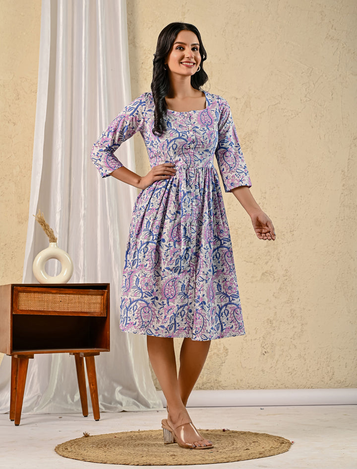 White Purple Jaal Hand Block Printed Cotton Dress With Front Buttons